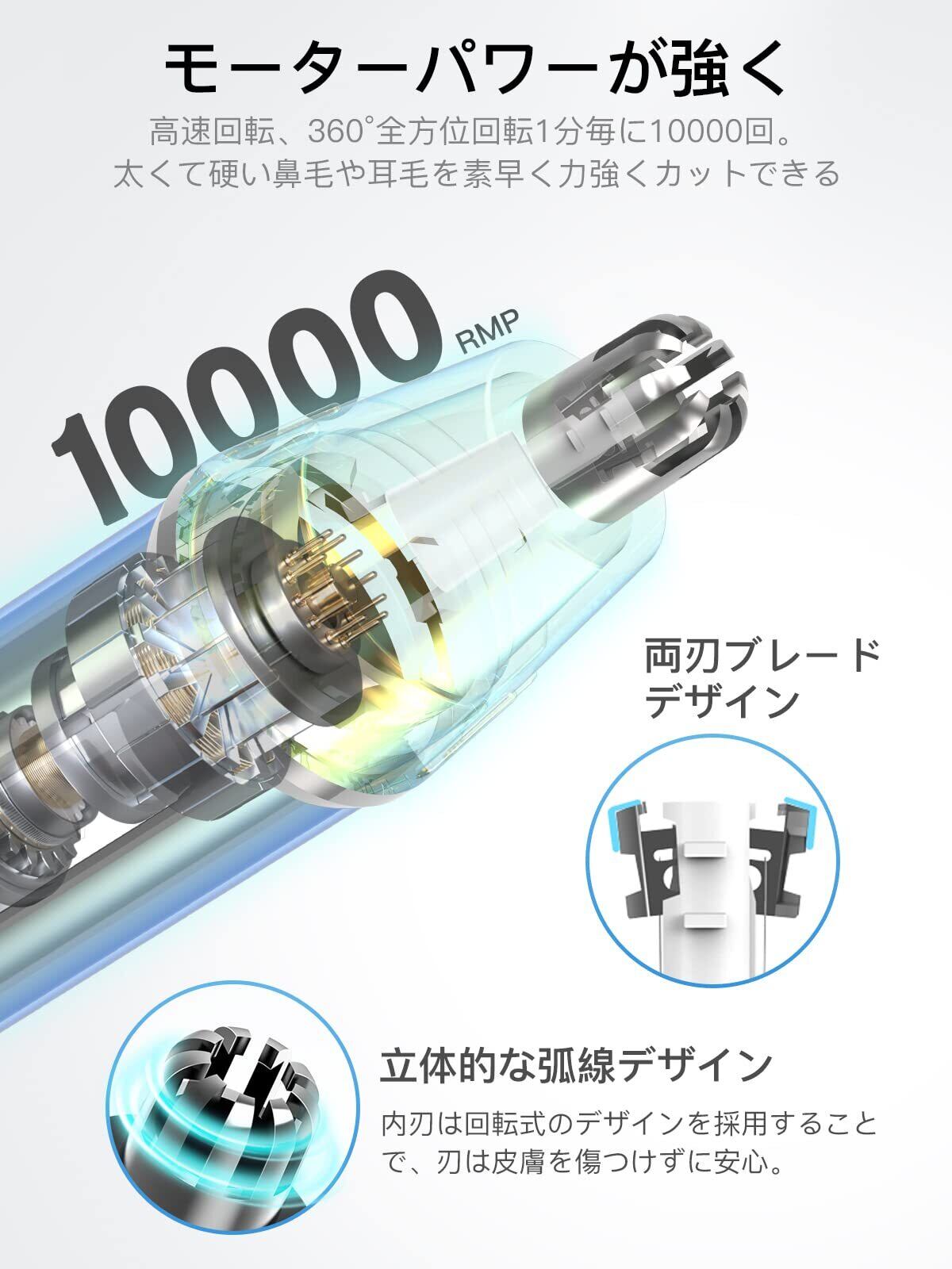 【強力 無痛 安全】悩んでいる鼻毛を素早く正確にキャッチすることに優れた、低刺激の両刃システムを採用した4in1鼻毛カッター メンズです。 エチケットを守るために、毛を適切な長さに刈り込みます。 10,000RPMのエチケットカッター 高速モーター駆動を搭載しております。 電動鼻毛カッターは、電池残量が少なくなっても、パワーレベルを着実に下げることができるので、毛を引っ張ることによる痛みやケガを防ぐことができます。