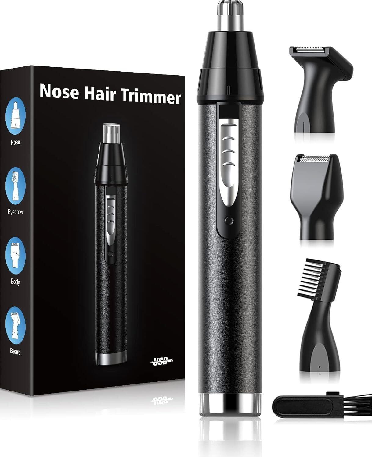 【パッケージの中身】鼻毛シェーバー本体*1、眉毛カッター*1、フェース/脇カッター*1、もみ上げカッター*1、洗浄ブラシ*1、取り扱い説明書*1、Type-Cケーブル*1、もしアタッチメントがなければ、お気軽にお問い合わせしてください。耳げカッターは到着際にご使用できない場合は約2-3時間程度充電してから電源を入れてみてください。