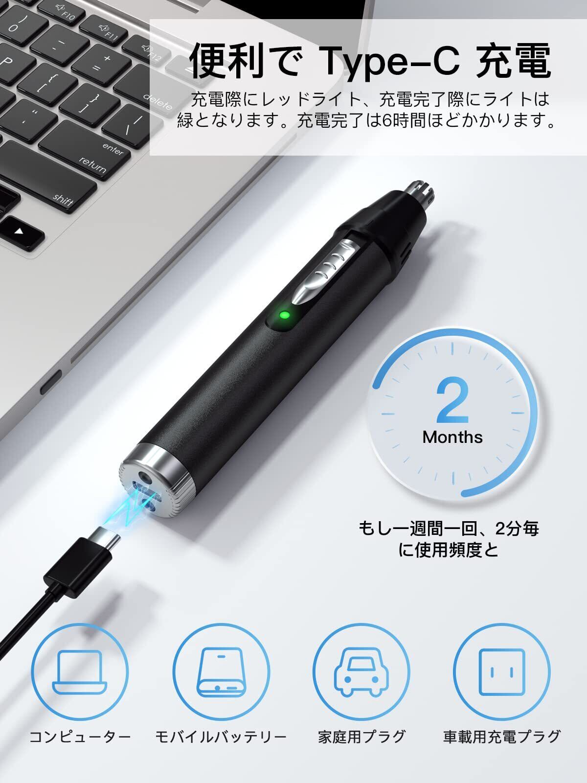 【Type-C 鼻毛カッター メンズ 充電式】乾電池と決別し、耐久性の高い内蔵バッテリーを採用しております、USBの充電ポート(ケーブル付属)により、モバイル電源やパソコン、USBカーチャージャーにいつでも接続でき、持ち運びに便利です。 鼻毛剃り アップグレードされたモーターは、よりパワフルでありながら消費電力が少なく、まゆげ シェーバー メンズは一回充電すると、2ヶ月ほど使用することが出来ます。スマートアラート機能付きで、充電完了際にインジケーターランプが赤から緑に変化します。