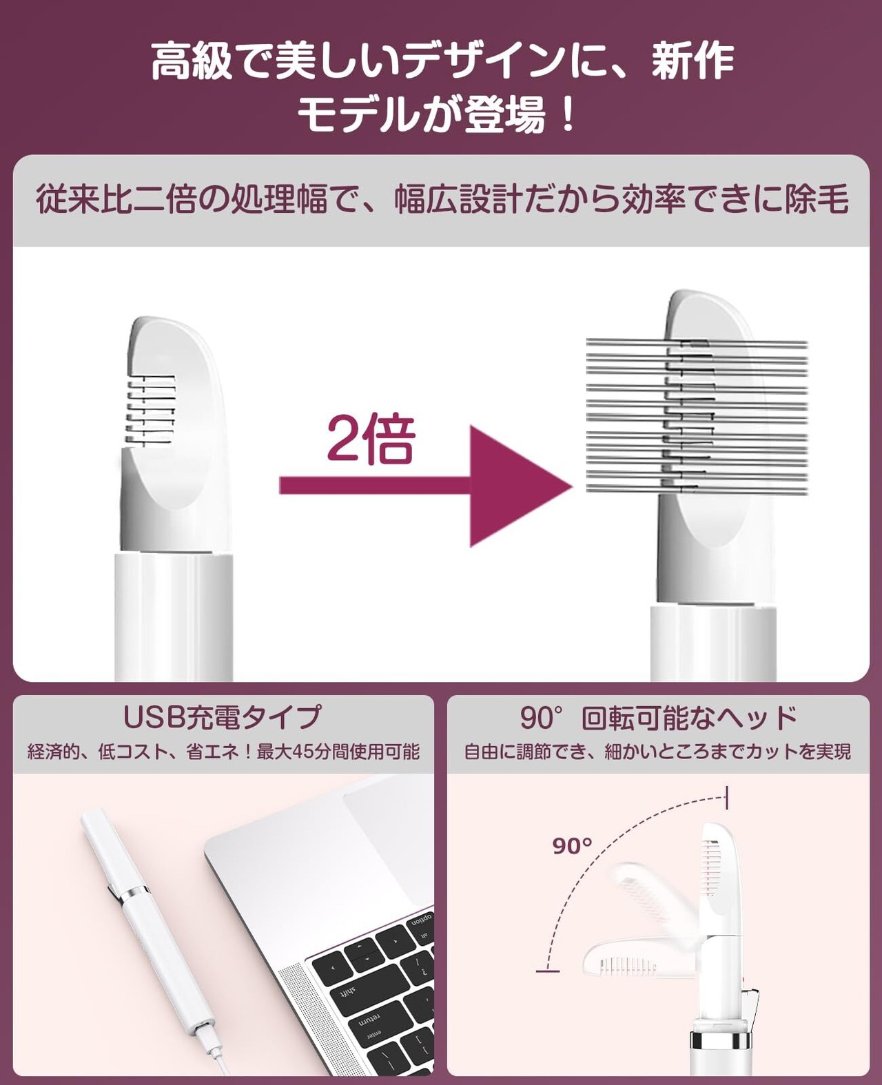 特徴 USB充電, 携帯便利, 熱線処理&火傷の心配なし, 2倍のスピードで除毛, 90°回転可能なヘッド