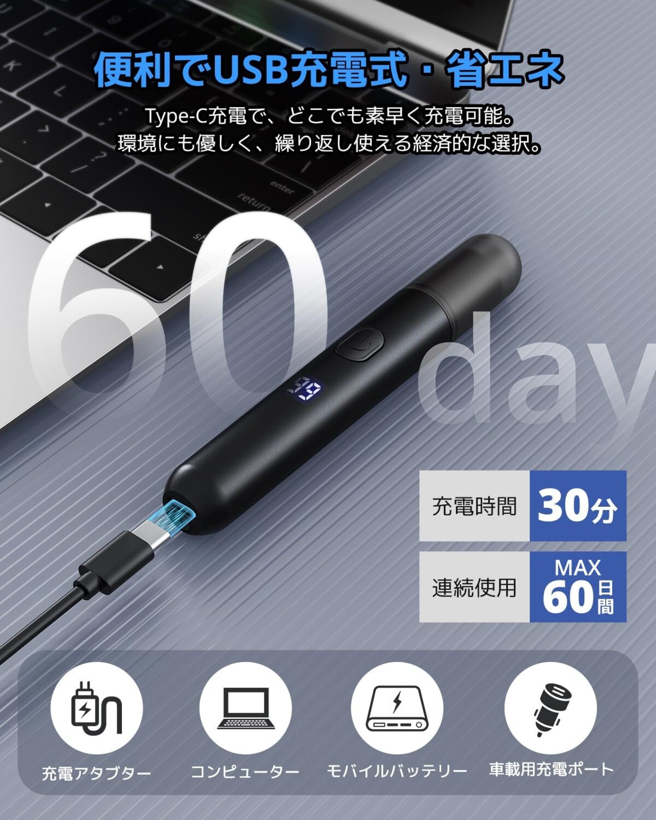 【USB充電式・長時間使用可能】USB充電式で、忙しい日々の中でも手軽に充電可能。わずか1時間でフル充電が完了し、最大60日間も使用できるため、頻繁に充電する手間を省けます。旅行や出張時でも充電を気にせず長時間使えるので、外出先でも完璧な眉毛ケアを維持できます。さらに、パソコンやモバイルバッテリーからも充電でき、非常に便利。充電の心配がないので、どこでも自信を持ってお手入れできます。(※本製品は【5V/1Aの充電器】での充電を推奨しております。急速充電器(5V/1A以上)などをご使用の場合、製品の寿命を縮めたり、故障の原因となる可能性がございます。)
