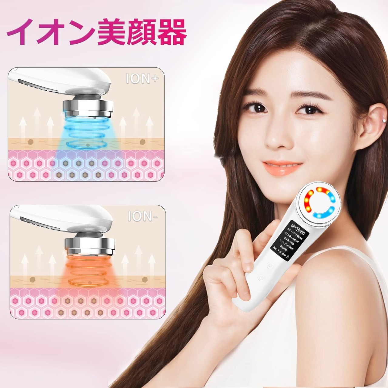 【イオン美顔器】①cleanモードはコットンリングでメイク落としや化粧水を含めるコットを固定して使用します。②importモードと③ledモードは美容液やローションの後に使用します。④emsモードはシートマスクをつけて使用します。⑤eyeモードはアイクリームを使用後に使用します。ハンドルのシルバー誘導センサーを触れながら電極ヘッド全体がお肌に触れるようにゆっくり移動してください。