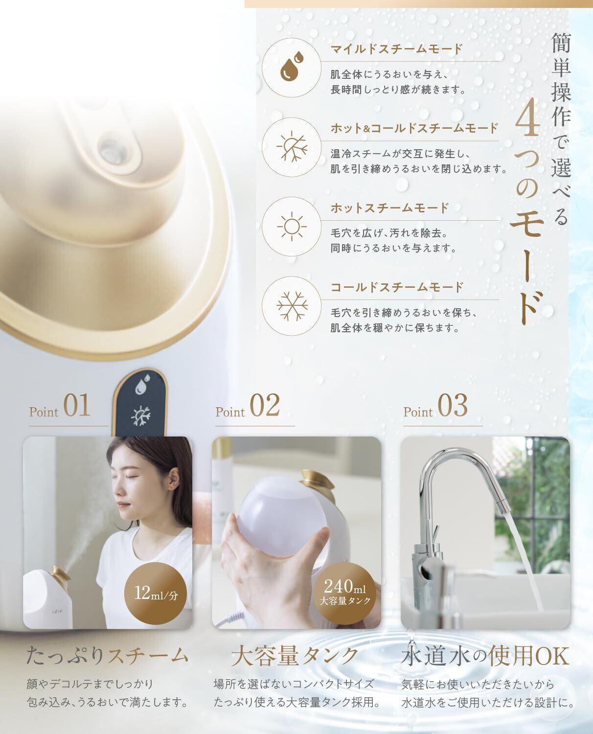 ️【4つのスチームモード搭載】①マイルドスチームモード:肌全体に潤いをもたらし、使用後、長時間しっとり感を与えます。②ホット&コールドスチームモード:ホットスチーム、コールドスチームが交互に発生します。ホットスチームで毛穴を広げ、潤いを与えた後コールドスチームで毛穴を引き締め潤いを閉じ込めます。③ホットスチームモード:ホットスチームが毛穴を広げ、汚れを除去。同時に潤いを与えます。 ※スチーム発生まで30秒くらいかかります。④コールドスチームモード:コールドスチームが毛穴を引き締め潤いを閉じ込めた後、肌全体を穏やかに保ちます。