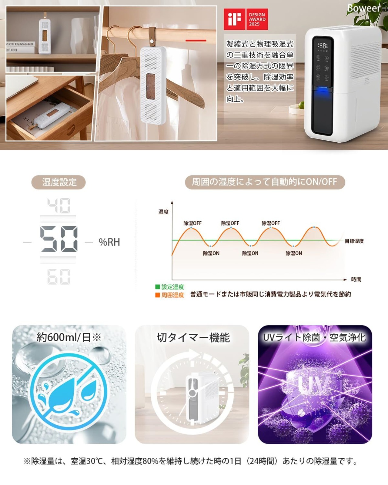 Boweer 除湿機【凝縮&物理吸湿の二重技術】無電源除湿ボックス装備 除湿器 2L大容量 タイマー付き 自動停止 強力除湿 部屋干し 湿気取り 衣類乾燥 カビ対策 梅雨対策 小型 コンパクト 静音 省エネ リビング/寝室/脱衣所/台所/押入れ/トイレ/クローゼット 狭い空間向け (ホワイト)