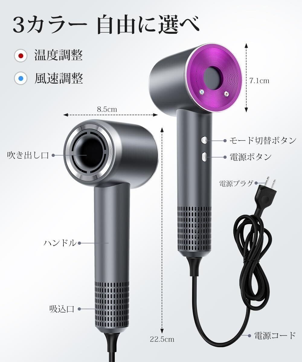 【ドライヤー 大風量で1.5倍速乾|毎日のヘアケアを時短革命】本ヘアドライヤーは、最大2.2㎥/分のドライヤー 大風量を実現し、一般的なドライヤーに比べて約1.5倍速く乾燥可能。風が髪の根元までしっかり届き、熱に頼らず風力で乾かすため、ドライヤー 速乾かつ髪にやさしい構造です。忙しい朝や入浴後も、効率的かつスピーディーにスタイリングできます。