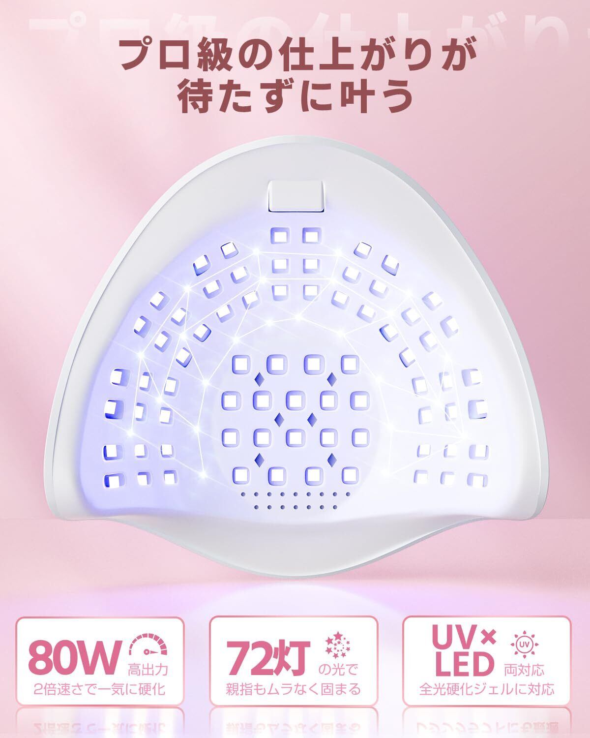 ●【72灯×UV・LED両対応、ムラなし全方位・全光硬化ジェルのプロ級仕上げ】親指までムラなく、しっかり均一に硬化します。◆【72灯360°たっぷり照射】本体内部に72灯ものLED素子を搭載し、360°全方位から照射することで、指の角度や位置に関わらずしっかり光が届きます。特に親指方向には各18灯を重点配置。光が届きづらい部分もしっかりカバーします。塗りのムラや硬化残りを防ぎ、仕上がりの美しさが一段とアップ。初心者からプロまで納得の仕上がりです。◆【全光硬化ジェル対応】LED&UVライトは、UV(365nm)とLED(405nm)のW波長に対応し、レジン用にもネイル用にも幅広くご使用いただけます。「ネイルだけじゃない。ハンドメイドもできるのが便利」。多機能ネイルランプとして、ソフトジェル・ハードジェル・ビルダージェルはもちろん、UVレジン・LEDレジンなどすべての光硬化ジェルにしっかり対応します。ジェルネイル ライト1台で、ネイルからアクセ作りまで、毎日の「好き」を形にできます