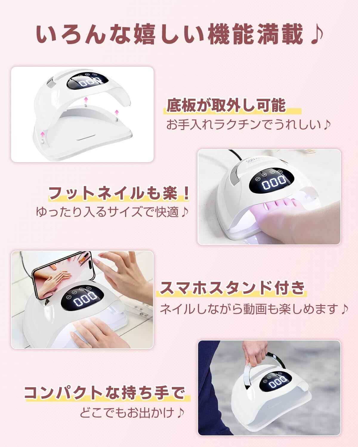 ●【うれしい機能たっぷり】「これが欲しかった」機能、全部入りのジェルネイル ライト 。細部まで行き届いたこだわり設計。◆【底板が取り外し可能】足元まで美しく、フットネイルも快適に美しく仕上がります。本体底部は簡単に取り外し可能なスライド式設計で、足の指も余裕を持って入れられるサイズ感。さらに、底板がないことでお手入れも簡単。毎回使うたびに清潔に保てるため、衛生面にも配慮したデザインです。手も足も、この1台でトータルケア。◆【スマホスタンド】ネイル中でも、動画を見ながら楽しく時間が過ごせます。本体天面にはスマートフォンを立てかけられるスタンド溝を搭載。ネイルチュートリアルを見ながら練習したり、お気に入りのドラマを観たりして、退屈な待ち時間もリラックスタイムに変えましょう。◆【持ち手付き】軽量設計&持ち手付きなので、友人宅やサロン勤務にも持ち運びがラク。どこでも美しさを手に入れられる、ネイル好きのためのマストアイテムです