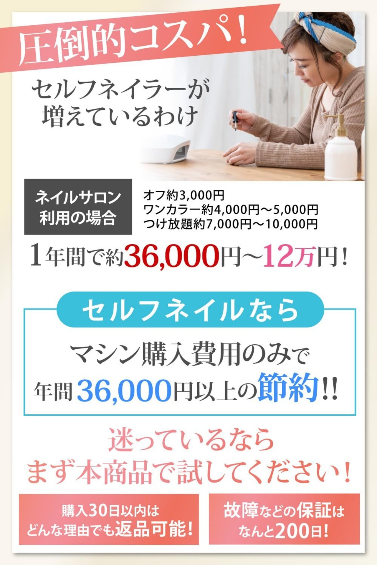 プロ用のネイルマシンは25000rpm回転とかなりのパワーがあります。素早くオフが出来るメリットありますが、初心者は扱いにくく使い方によってはかなり危険です。また、回転数が大きい分製造コストがかかるため、かなり高額となります。