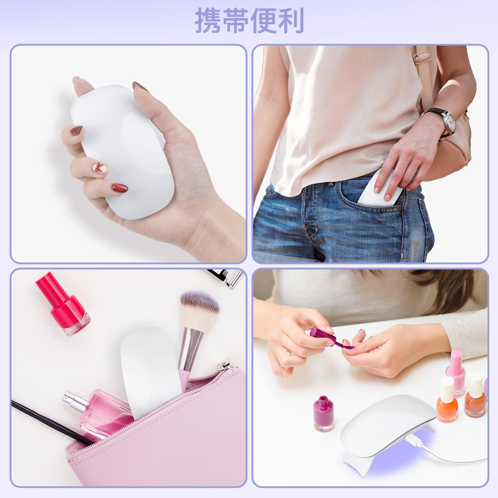 ポケットサイズのマウス型デザイン:このミニUVネイルランプはコンパクトで重量わずか80g。化粧ポーチやハンドバッグ、小さなポーチにもすっぽり収まるので、どこへでも気軽にお持ちいただけます。