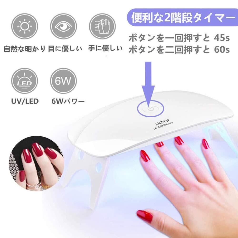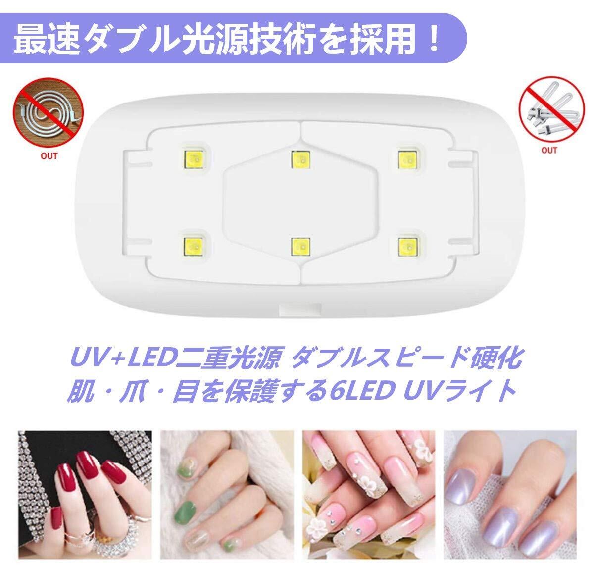 【UV+LED二重光源】6w最速ダブル光源技術を採用し、ダブルスピード硬化・ダブルパワー機能で硬化速度が2倍を速くなります。痛みを軽減し、色素を薄め、手が黒くなる心配もなく、手と目に優しいです。どんなジェルも、レジン液も硬化でき、ネイルジェルを速く乾燥させることができます。