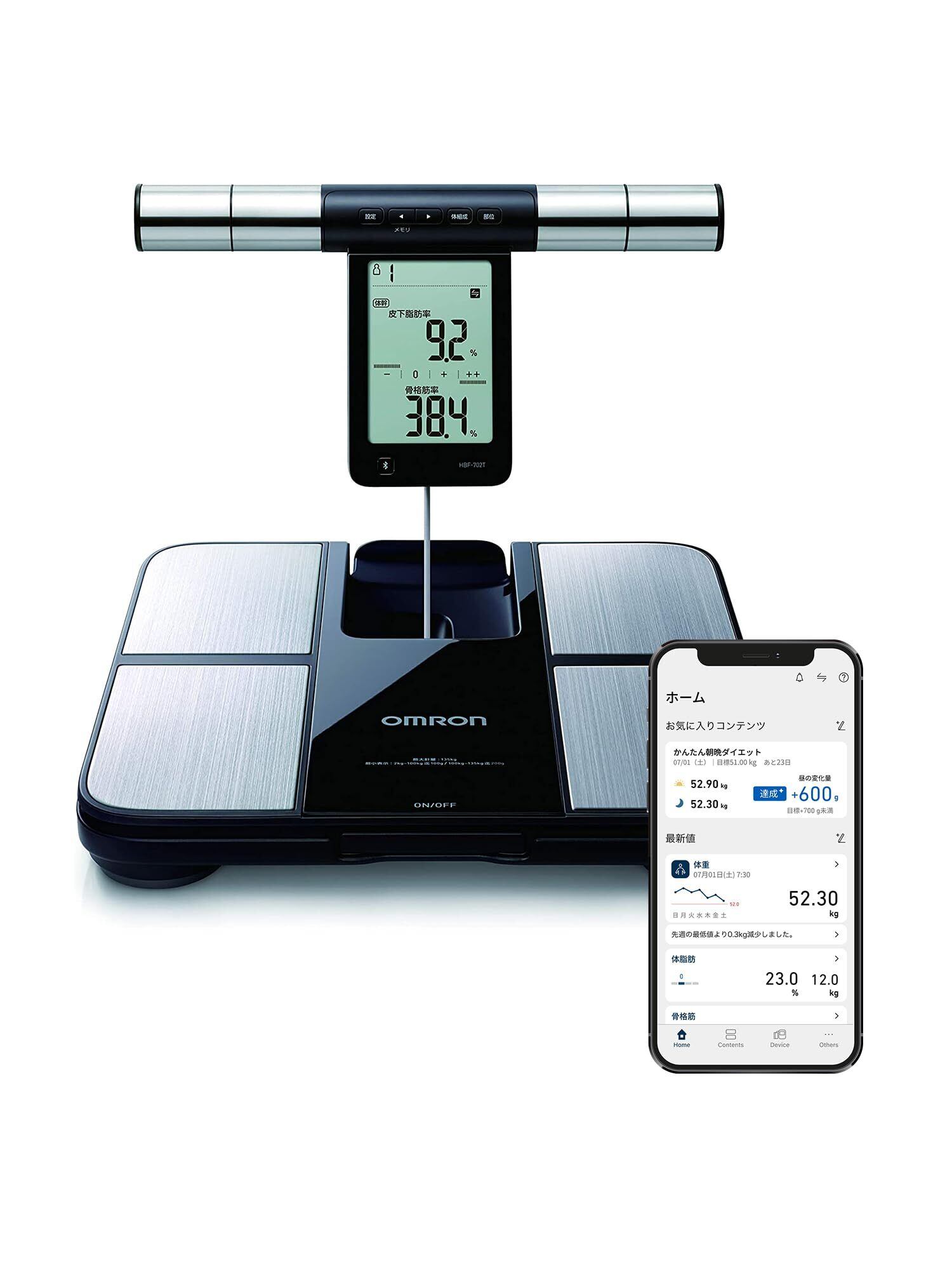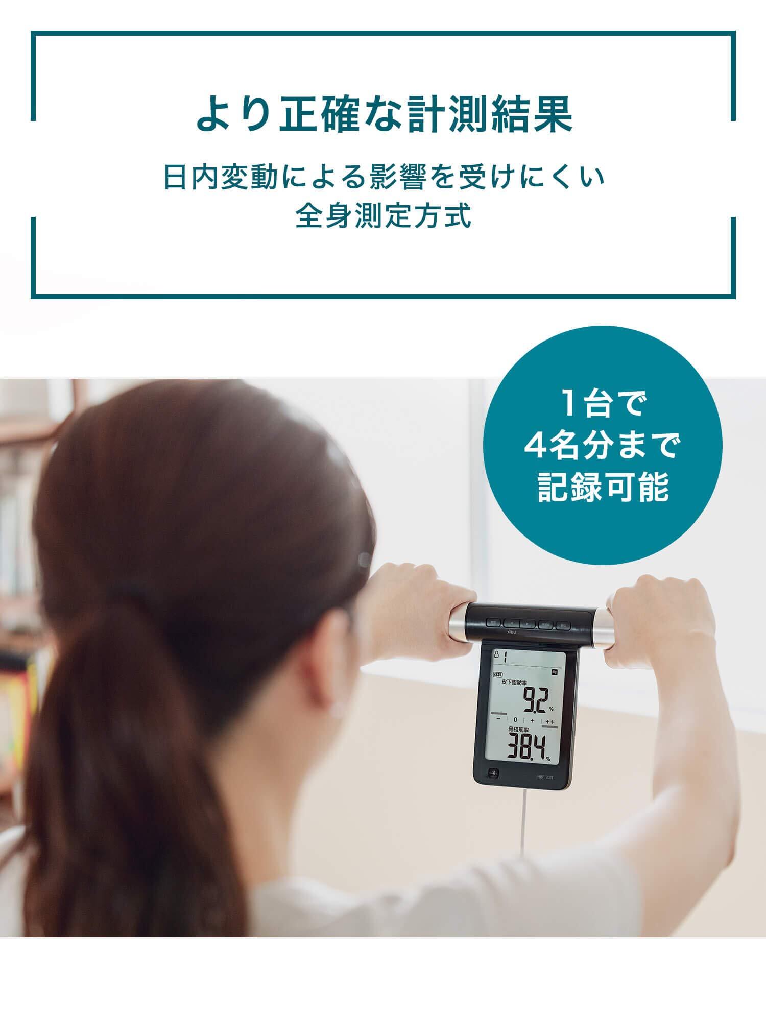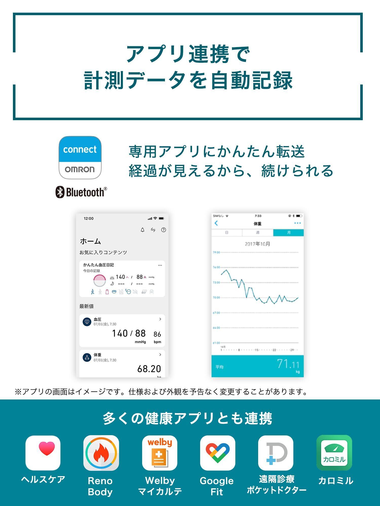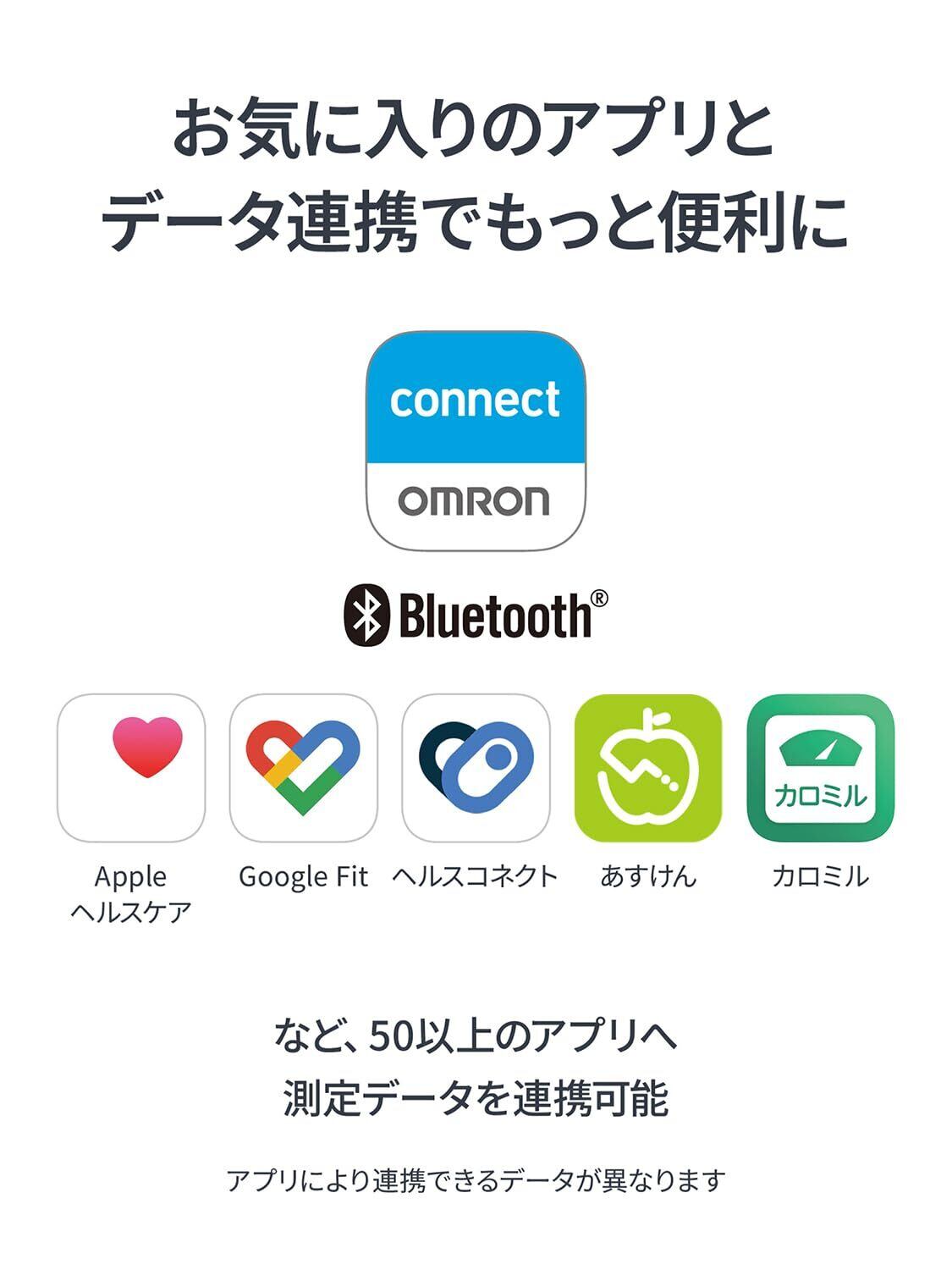 両手と両足で測定するタイプの体重体組成計です。両手両足から全身に微弱な電流を流すことで、体幹・両腕・両足といった部位別の体組成が分かります。Bluetooth通信機能を搭載。iPhone/Android専用アプリ「OMRON connect」に、測定データを転送し、体重や体脂肪率、骨格筋などの測定データを簡単に確認・管理することができます。