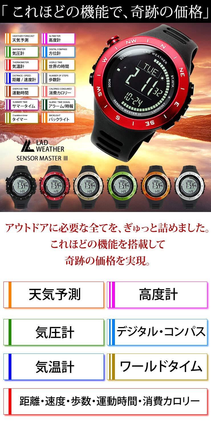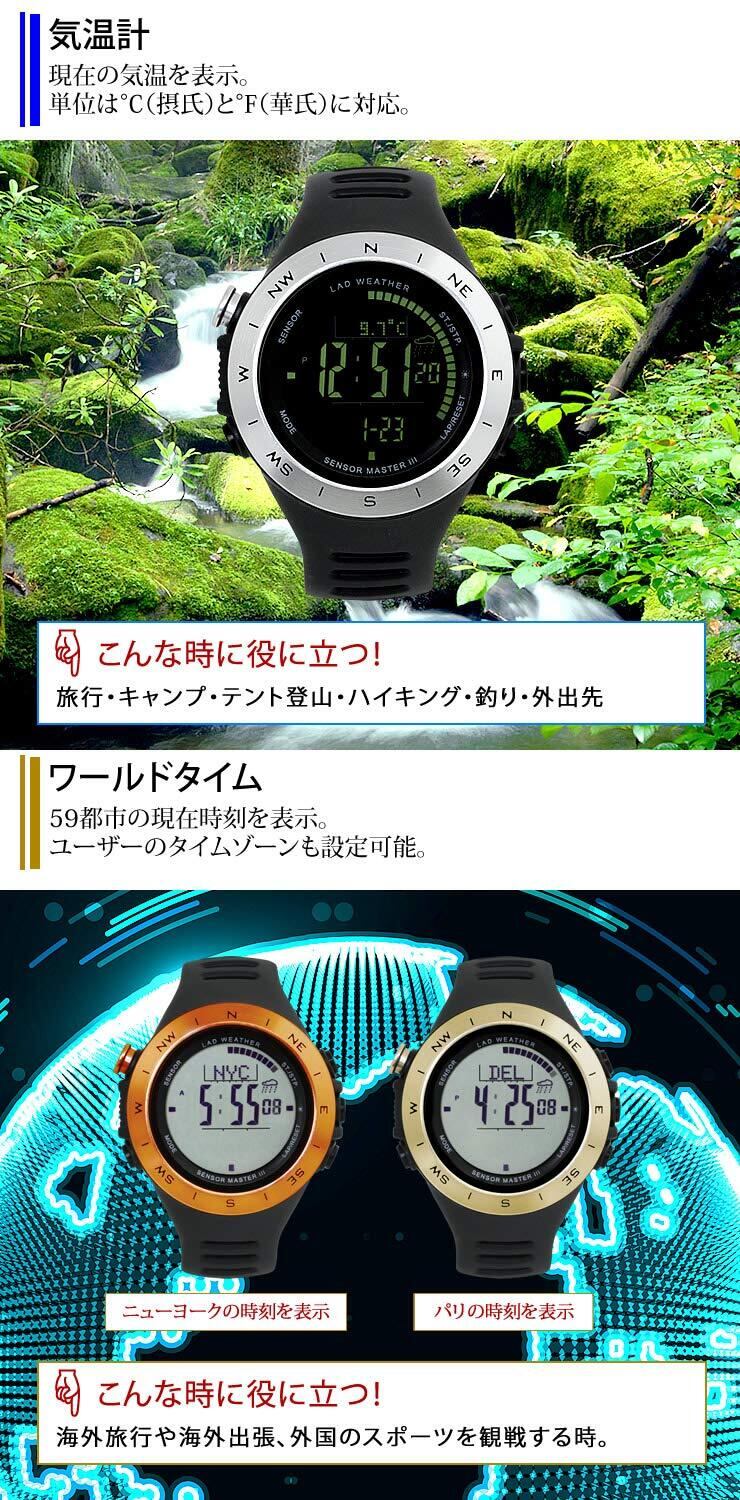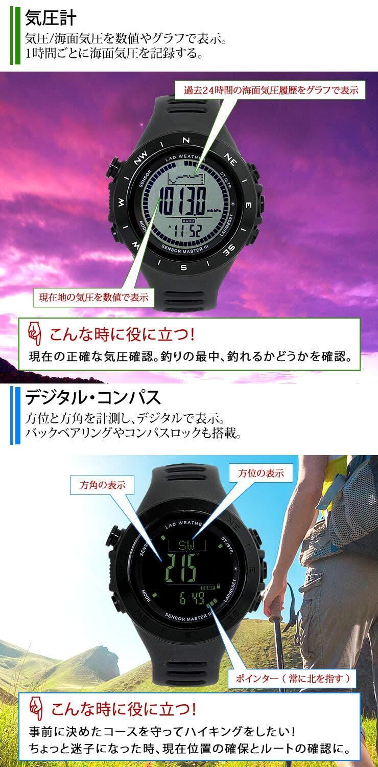 機能一覧:気圧計、高度計、気温計、デジタルコンパス、天気予測、活動量計、距離、速度計、歩数計、運動時間、消費カロリー表示、100m防水、ワールドタイム、タイマー、アラーム、時報、バックライト、サマータイム