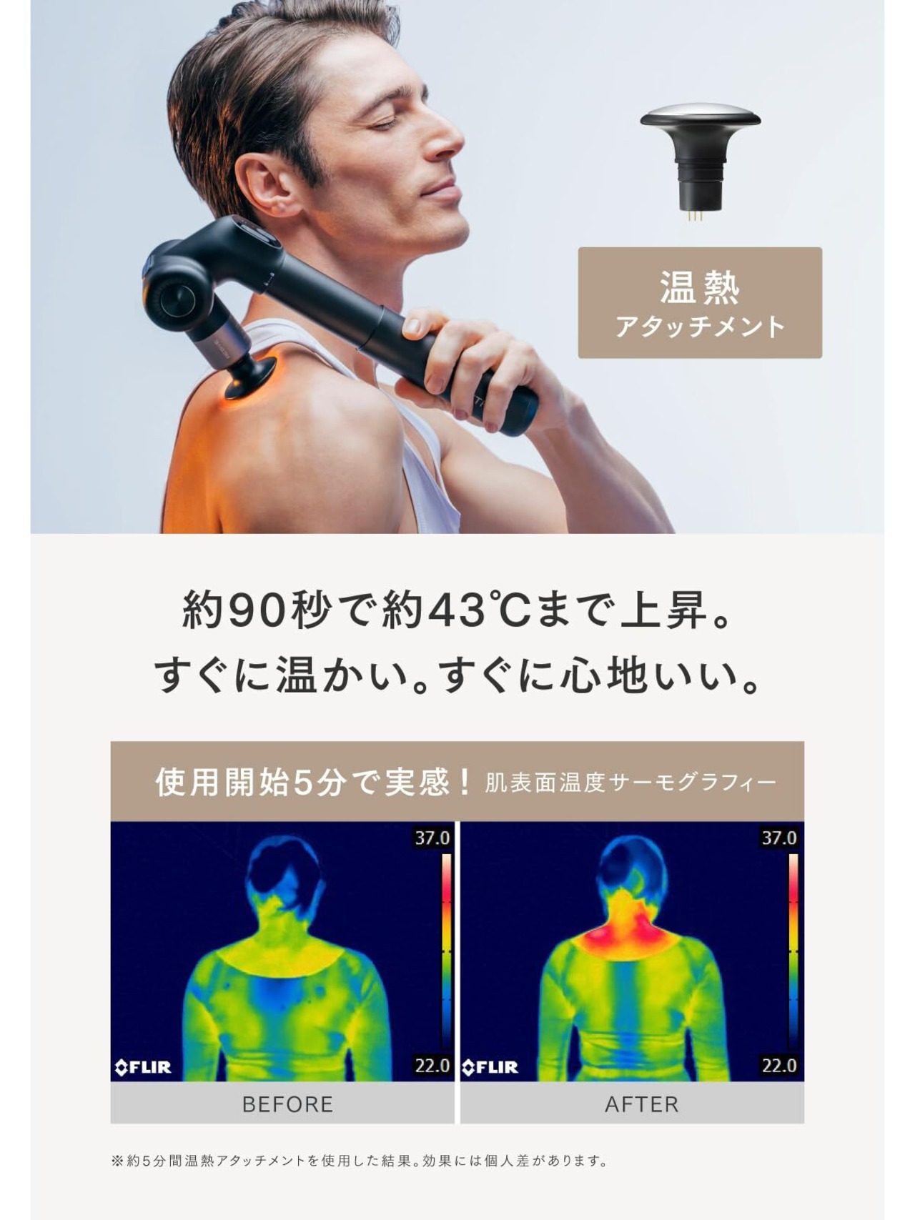 材質 本体:PC-GF20、ABS樹脂、アルミニウム合金、アクリル、ステンレス、シリコンアタッチメント:ABS樹脂、シリコン、(温熱アタッチメントのみ次を含む:アルミニウム)