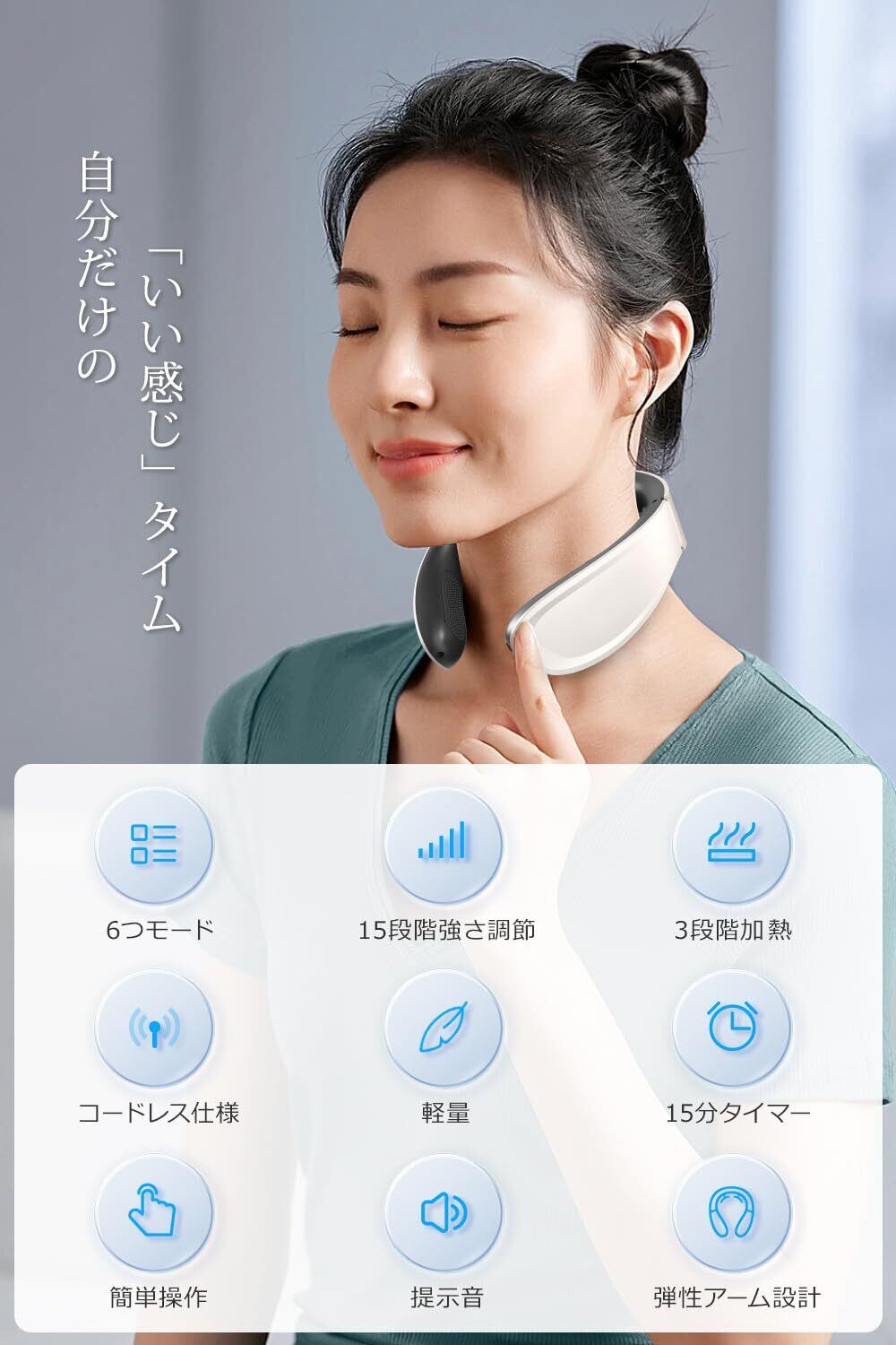 【新たな首ケア体験 振動機能もあり】 EMS刺激と程よい加熱してくれるパッドだけでなく、振動ヘッドも備えております。進化されたリラクゼーション器は、首元だけでなく、内側からもしっかりリラックス。各種機能がトリプル効果となり、1回わずか15分のケアで首周りの色んな筋肉をやさしくほぐします。深層までじんわり届く快適な刺激で、日々の疲れを取れます。