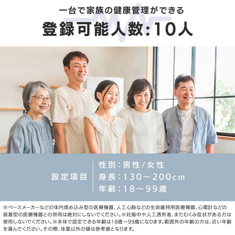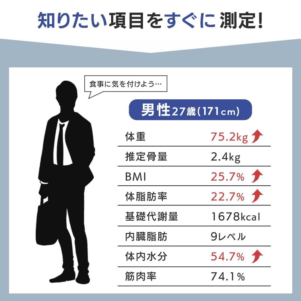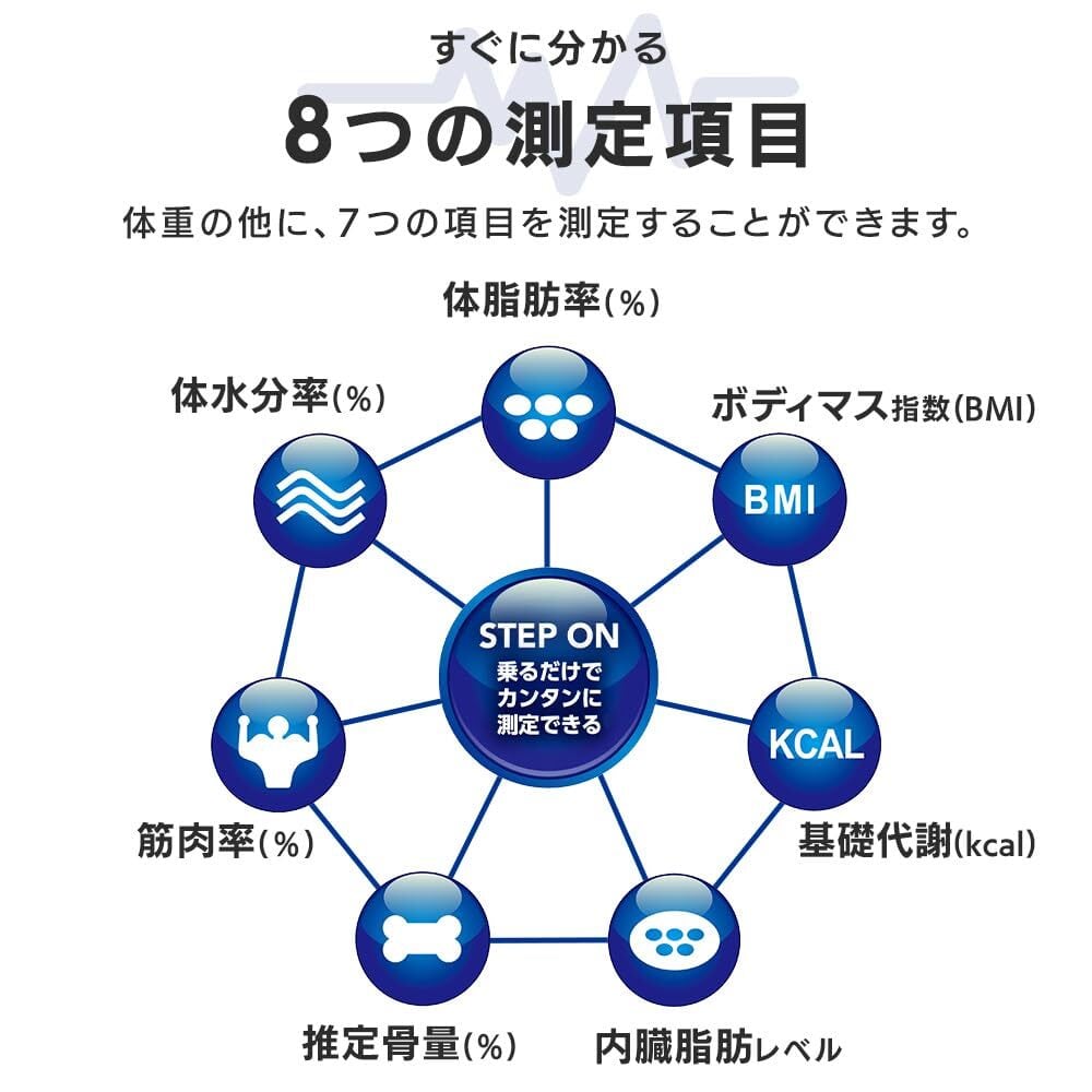 測定項目:体重、体脂肪率、体水分率、筋肉率、推定骨量、内臓脂肪レベル、基礎代謝、BMI