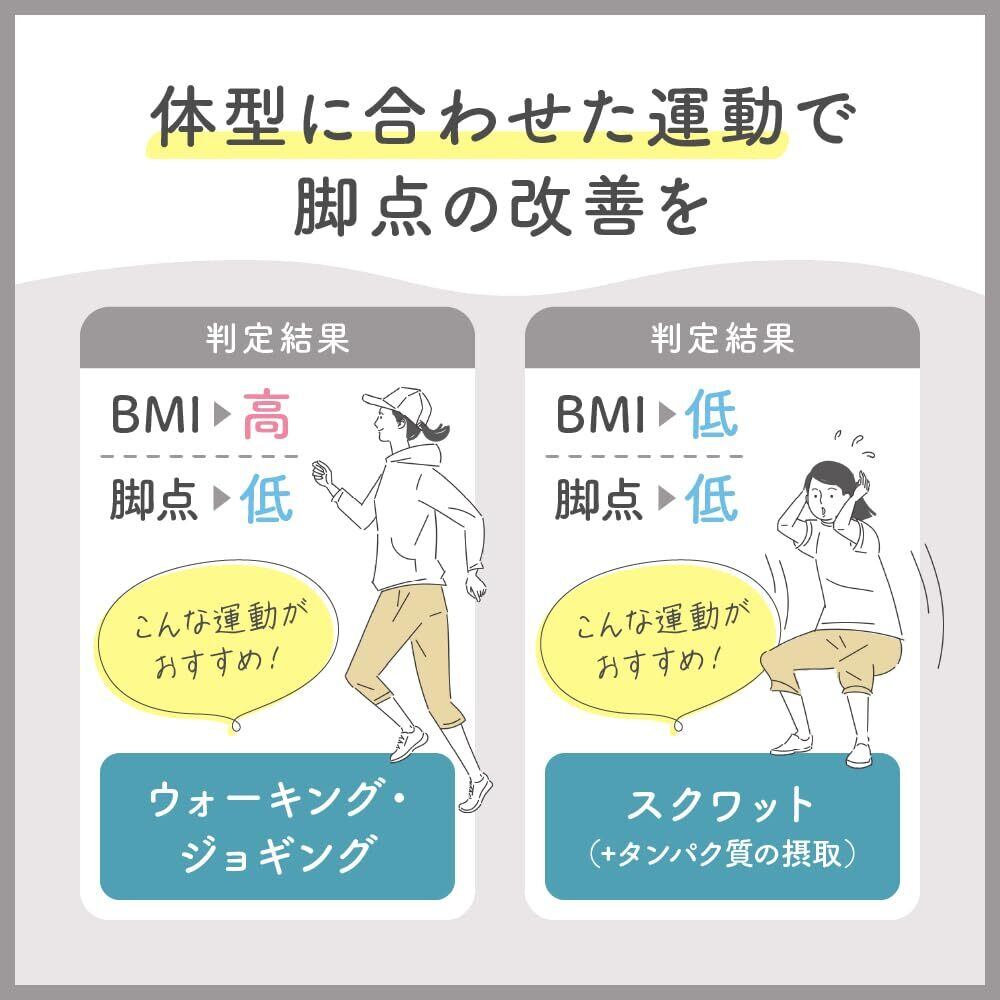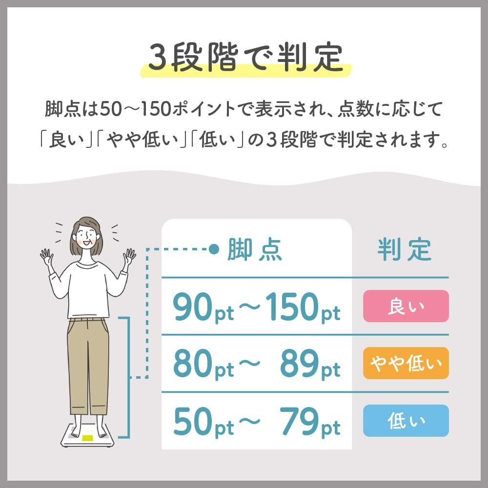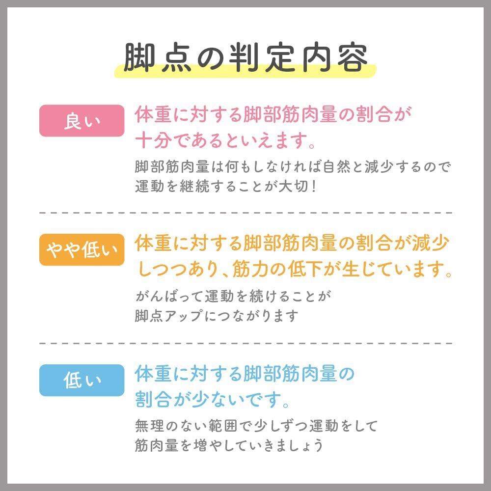 【「ビデオ」に脚点の解説動画 ロングver.を載せています。是非ご覧ください 】■ 体重を支えるだけの脚の筋肉量があるかを「脚点」として点数化・「脚点」は50~150 ポイントで表示され、点数に応じて「良い」「やや低い」「低い」の3段階で判定 ■ 測定項目 体脂肪率/筋肉量/内臓脂肪レベル/体重/体内年齢/基礎代謝量/BMI ■ 乗るだけで測定ができる「乗るピタ」を搭載 立てかけ収納OK
