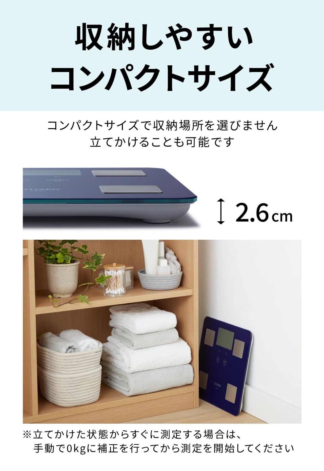 【場所を取らない薄さ26mmのスリムデザイン】本体の厚さ26mmは500円玉の直径とほぼ同じ。強固ガラスで135kgまで測定可能です。立てかけ収納で出し入れもラクにできます。