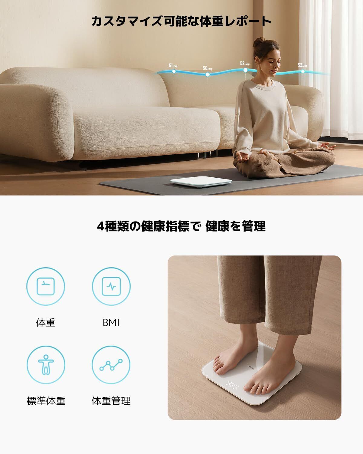 【1度の計量で4項目の測定】体重やBMIなどの身体指標のリアルタイム測定だけではありません。身長と年齢から理想の体重を計算し、体重管理のアドバイスによって不健康なダイエットや極端な減量による健康リスクを低減します。