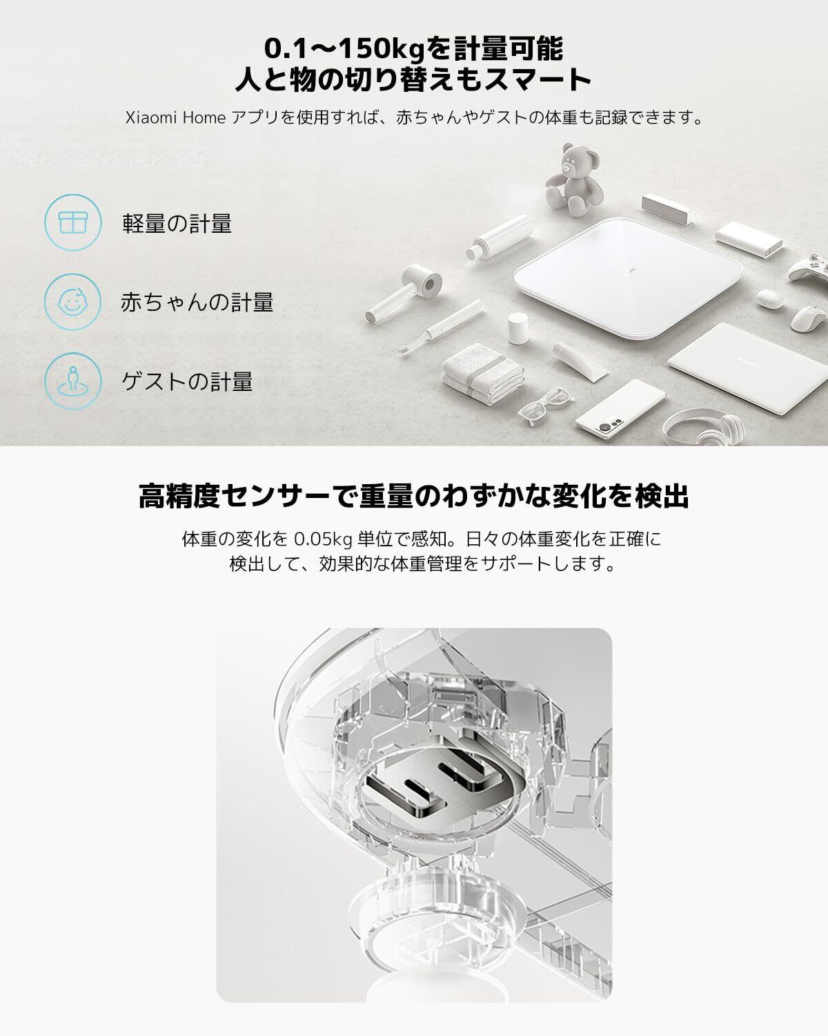 【単位0.05kgの高精度センサーで人も物も量れる】体重の変化を0.05kg単位で感知。日々の体重変化を正確に検出して、効果的な体重管理をサポートします。
