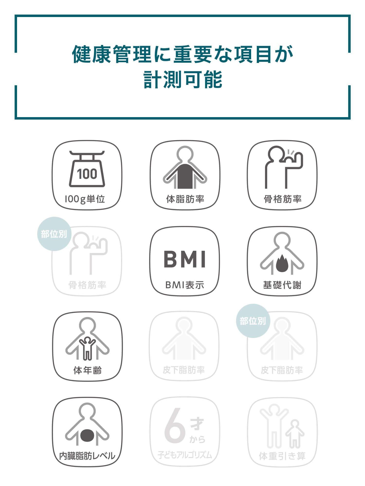 ●表示:BMI、体脂肪率/体脂肪率判定/基礎代謝/骨格筋率/骨格筋率判定/基礎代謝/骨格筋率/骨格筋率判定(対象年齢10才以上80才以下)、内臓脂肪レベル/内臓脂肪レベル判定/体年齢(対象年齢18才以上80才以下)