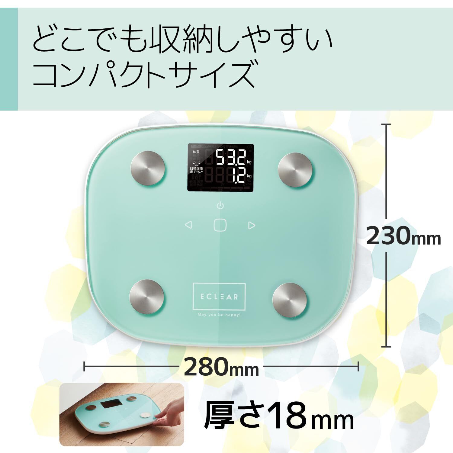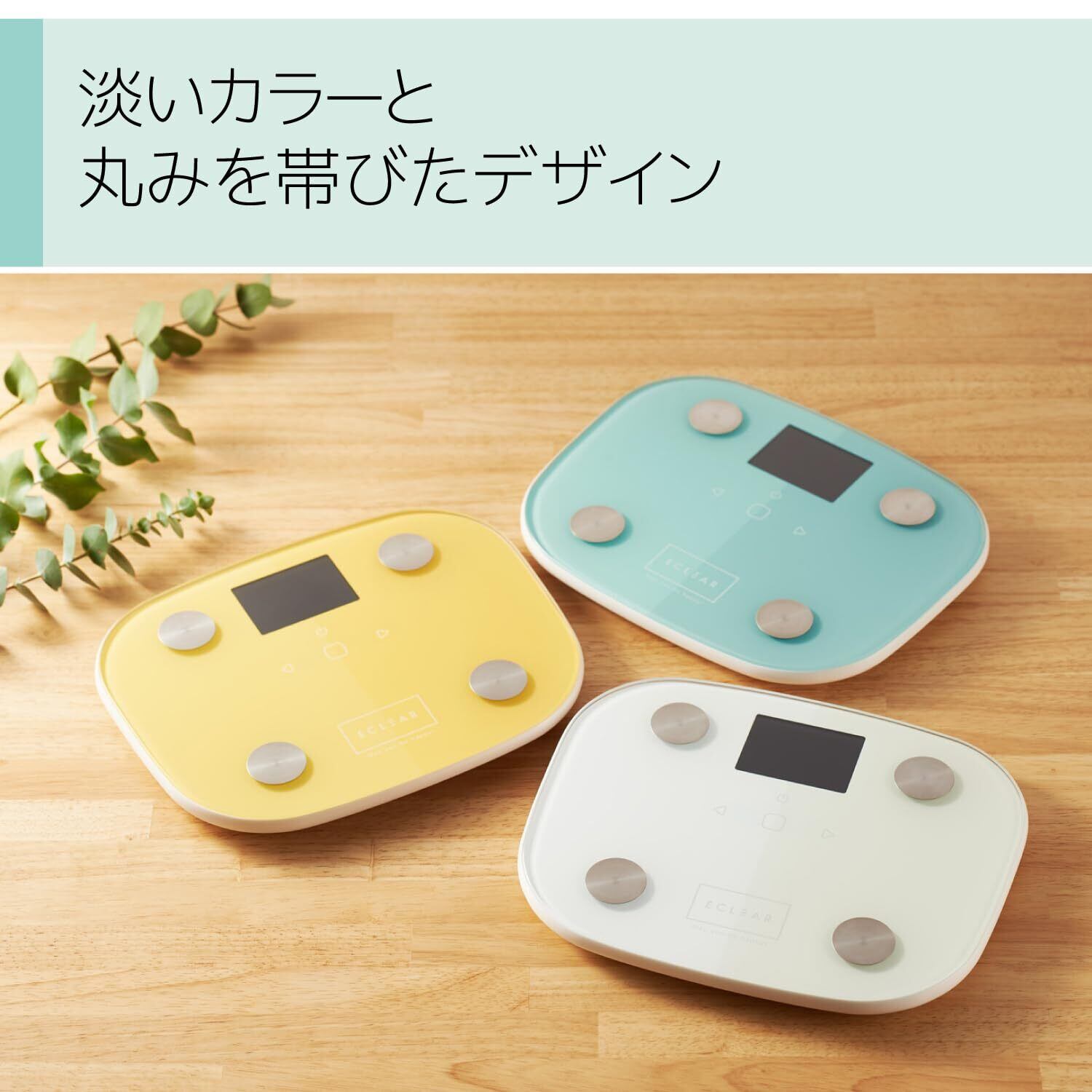 ●目標体重設定機能と顔文字表示で毎日の変化が見える"ECLEAR 体組成計"。●目標体重と現在の体重の差を表示する"目標体重設定機能"によって、目標との差が一目でわかり、モチベーション維持に最適です。●目標体重に対する成果がわかりやすい"顔文字表示機能"搭載。●目標体重に近づくとアイコンが笑顔になるなど、表情で一目でわかります。●体重・BMI・体脂肪率・基礎代謝の4項目が測定可能です。●筑波大学と共同研究した独自のMRI測定方式により、より正確な体脂肪率の測定が可能です。●乗るだけで過去の測定データから個人を推定する"自動認識機能"を搭載。●電源を入れるなどの手間がかからず、すばやく簡単に測定できます。●暗い場所でも表示が見やすい"バックライト"を搭載しています。●厚さ約18mmのコンパクト設計で収納にも場所を取りません。●専用アプリECLEAR plusに体重・体脂肪率を手入力すると、BMI、内臓脂肪レベル、骨量、骨格筋率、基礎代謝を確認できます。●体重、体脂肪率、骨格筋率はグラフで表示できるため、日々の変化を分かりやすく記録できます。