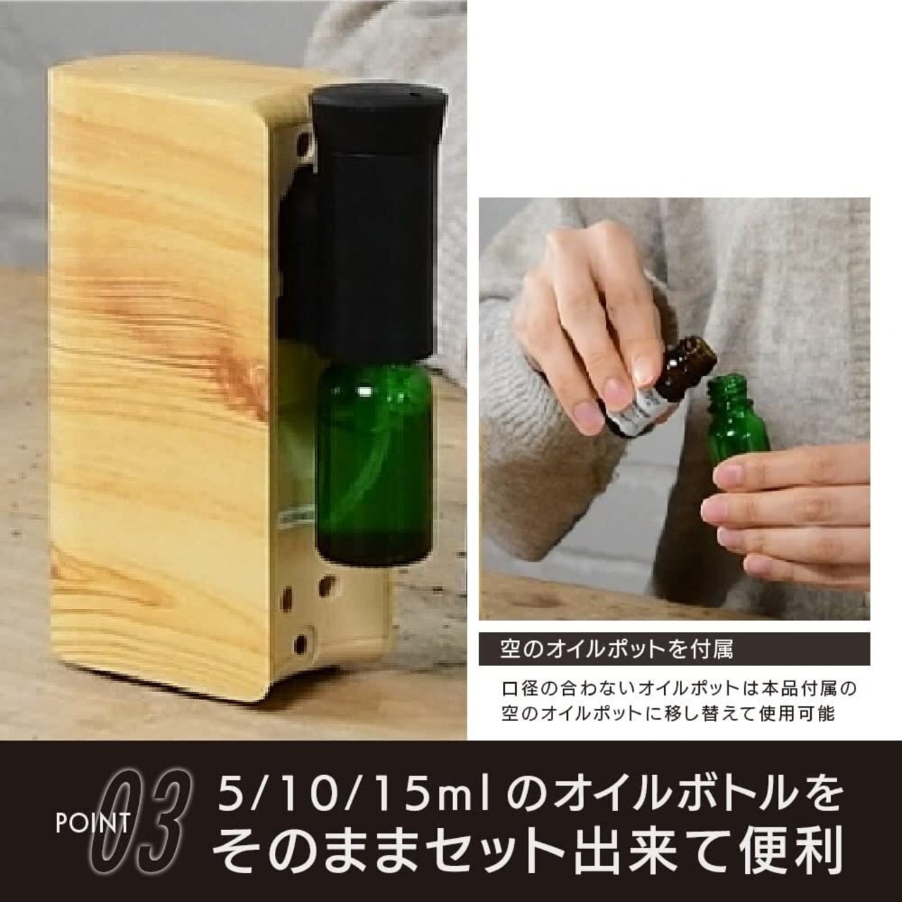 消費電力:約3W、容量:5ml/10ml/15mlのオイルボトル ※すべてのオイルボトルに対応しているわけではございません。