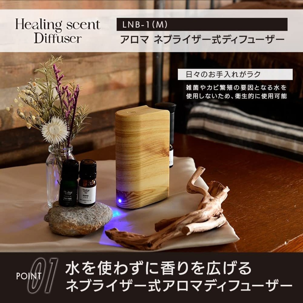 ●水を使わずにエッセンシャル(アロマ)オイルをミスト状にするネブライザー式アロマディフューザー。