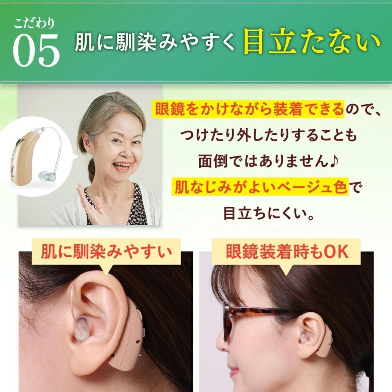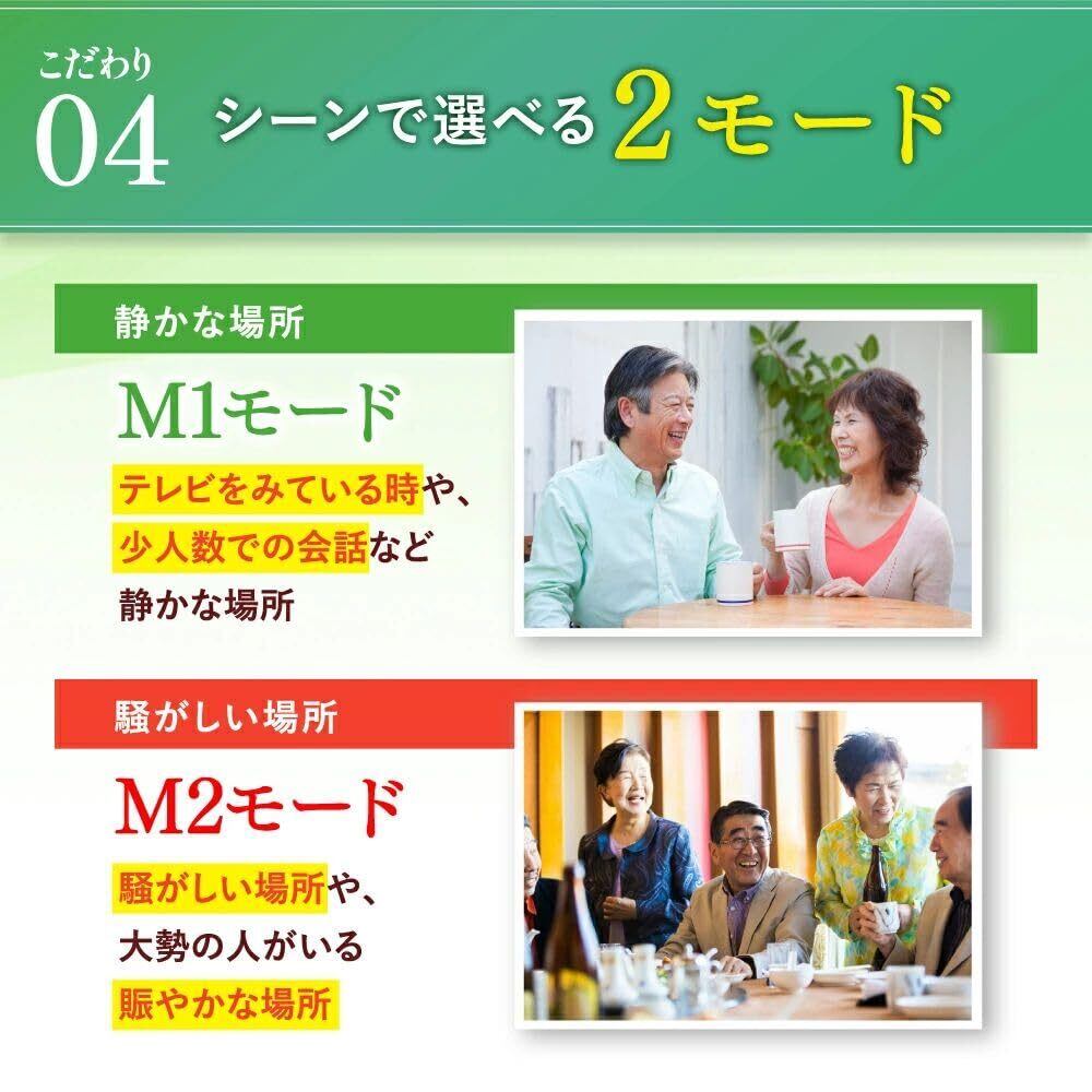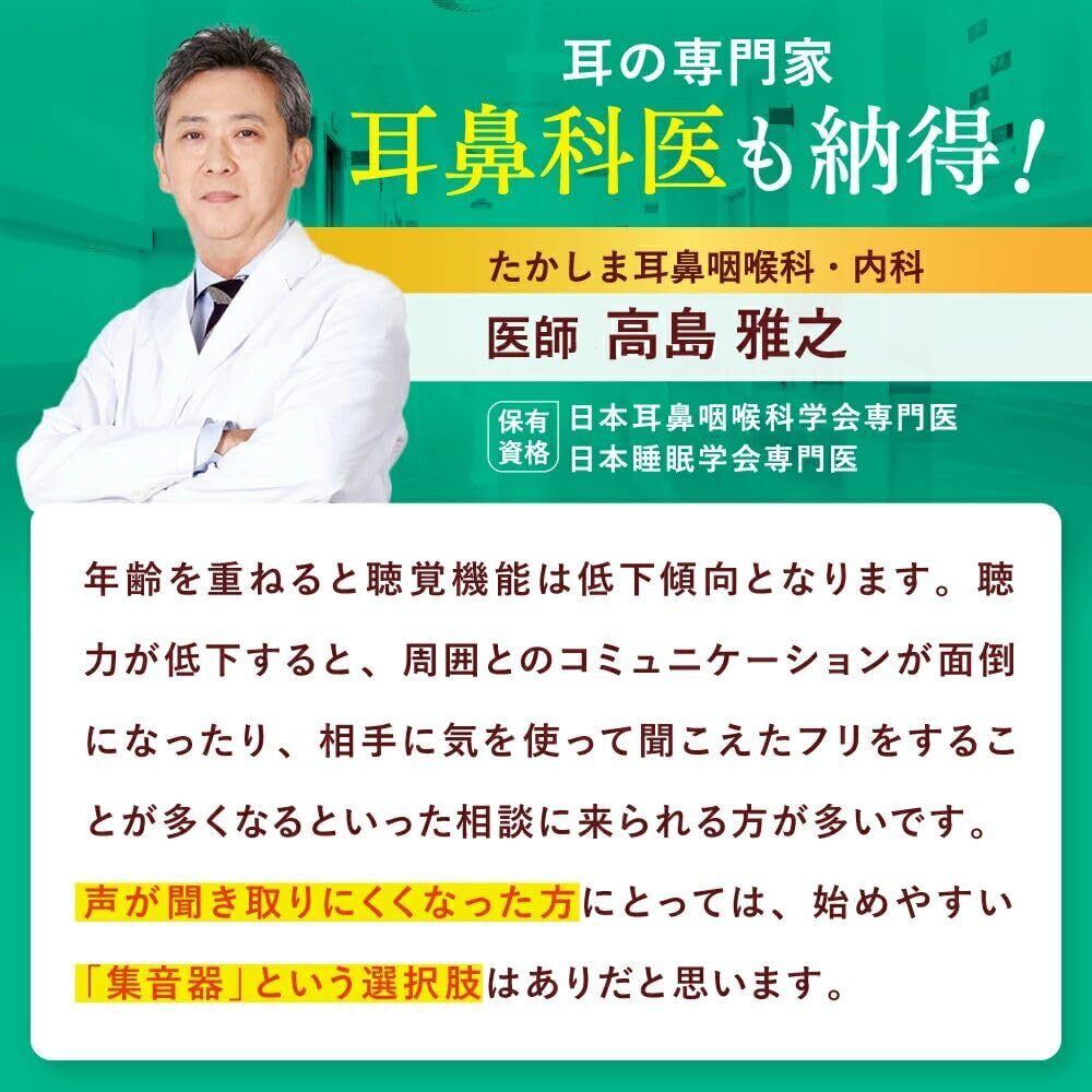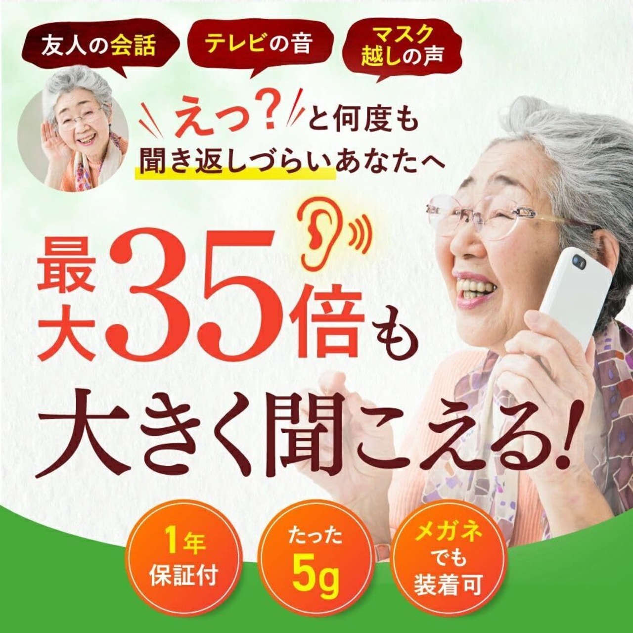 シニア向け/集音器 — 聞こえにくさを感じたらミミクリア。聞こえるって嬉しい/着けるだけだから初心者でも簡単。耳鼻科医も納得。友人の会話やテレビの音、マスク越しの声が聞こえづらい。連続40時間使用可能。高感度CICチップ搭載。