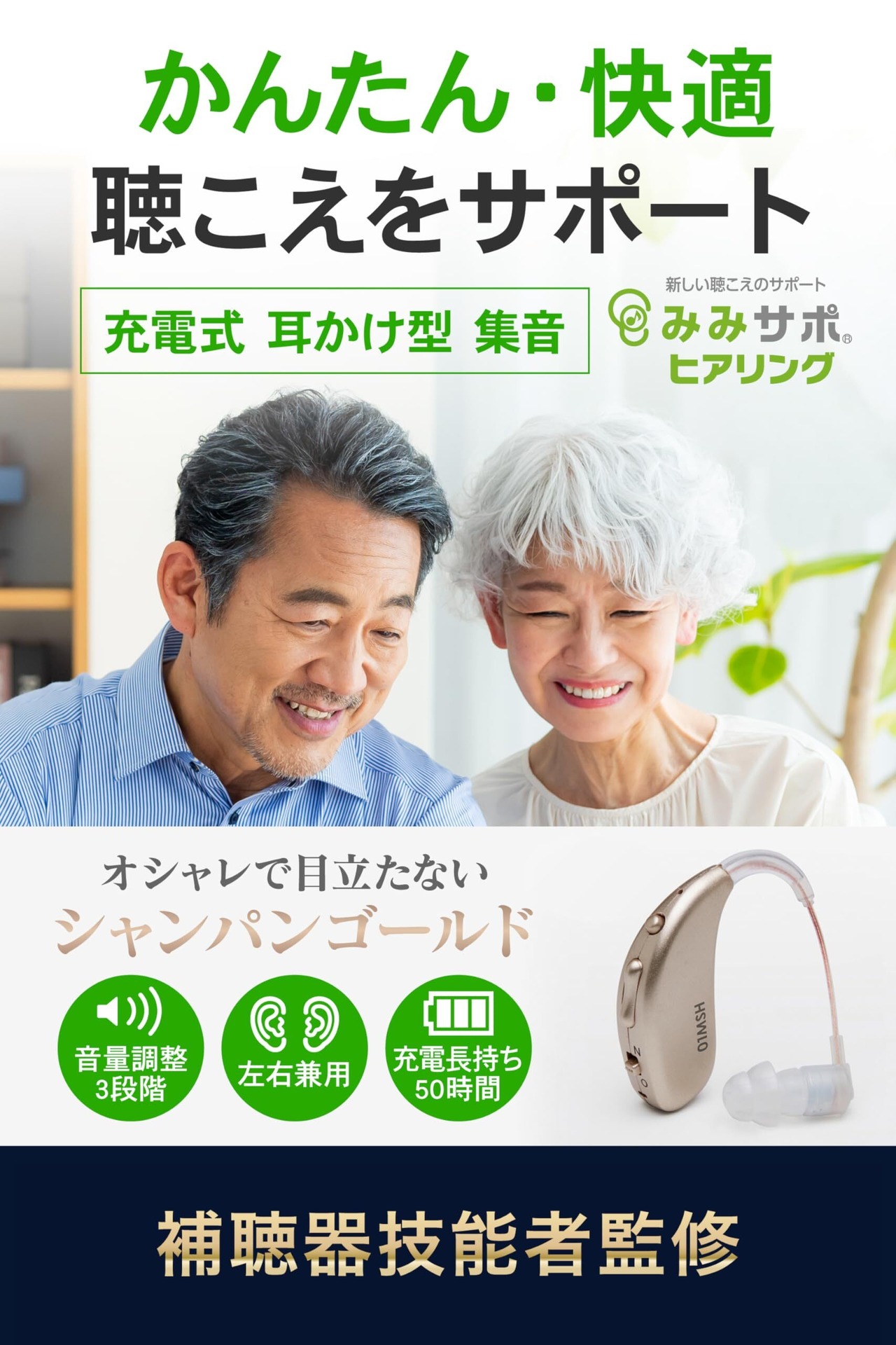 【認定補聴器技能者監修の集音器】みみサポヒアリングは、認定補聴器技能者が監修した、日本語の音に合わせた音響特性を採用しています。ハウリングを軽減し、周囲の音をクリアに拾い上げ、会話やテレビの音声を聞きやすくします。高齢者の耳の聞こえにくさに役立つ、認定補聴器技能者監修の集音器(しゅうおんき)です。