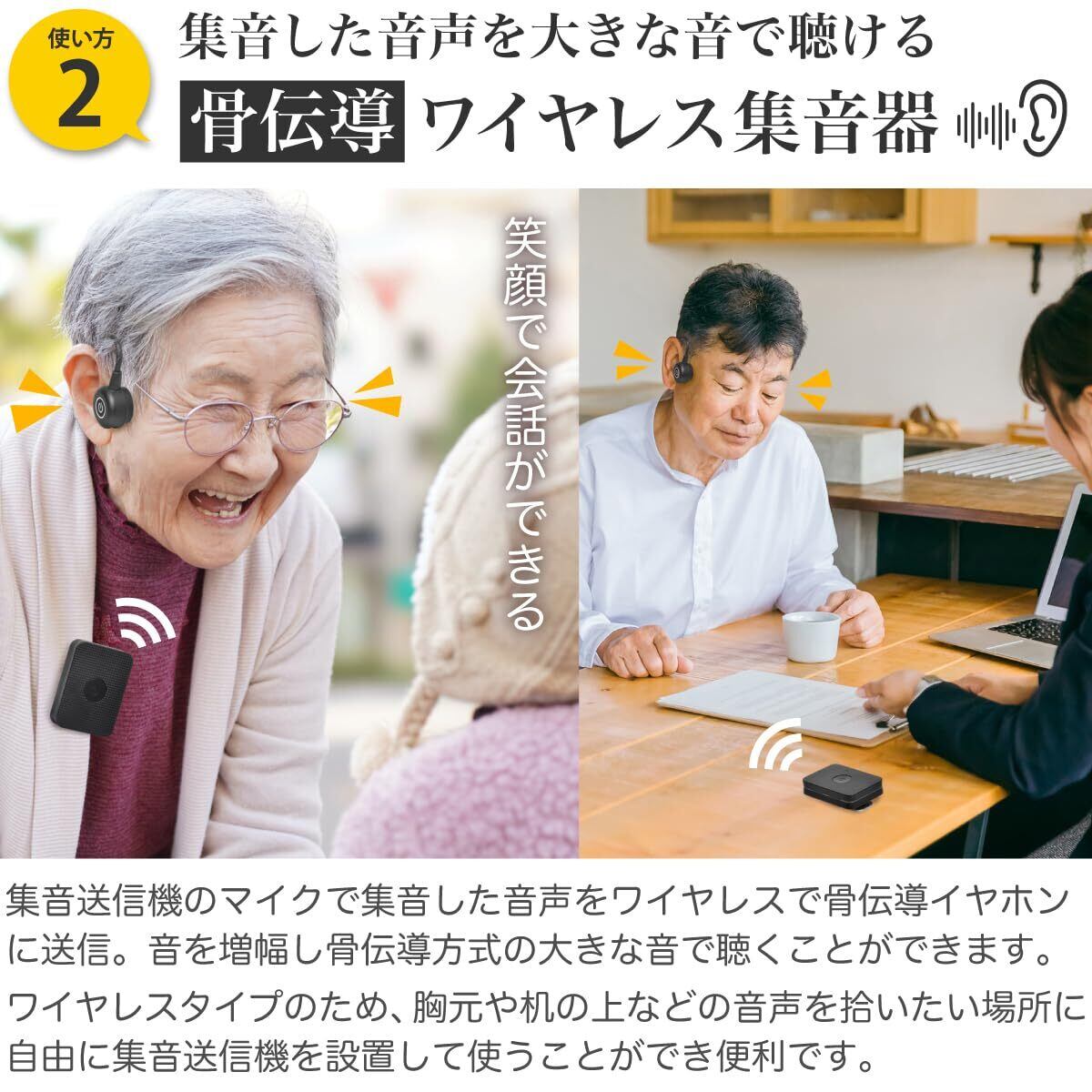 《使い方2》【集音した音声を大きな音で聴ける】集音送信機のマイクで集音した音声をワイヤレスで骨伝導イヤホンに送信。音を増幅し骨伝導方式の大きな音で聴くことができます。ワイヤレスタイプのため、胸元や机の上などの音声を拾いたい場所に自由に集音送信機を設置して使うことができ便利です。