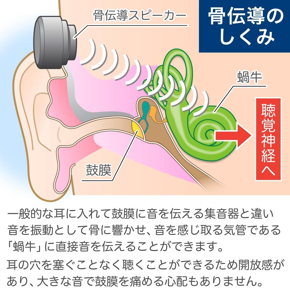 【振動で音が伝わる骨伝導方式】頭蓋骨に音の振動を直接伝えることによって耳や鼓膜を介さずに音を伝えることができる骨伝導方式。耳穴を塞がず使えるので開放感があります。
