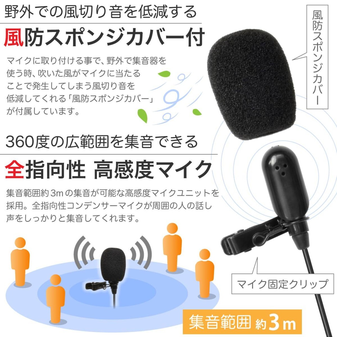 【360度集音できる全指向性マイク】広範囲(集音範囲3m)の集音が可能な高感度マイクユニットを採用。全指向性コンデンサーマイクが小さな音も集音してくれます。 風切音などを防ぐ風防カバーが付属します。