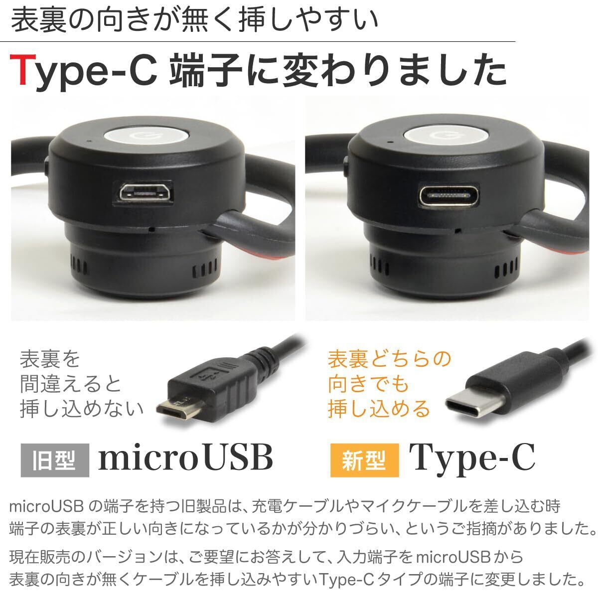 【Type-C端子に変更されました】 旧型の骨伝響で使用されていたmicroUSB端子から、表裏の向きを気にせずに充電ケーブルやマイクを挿しこむことができるType-C端子に変更されました。