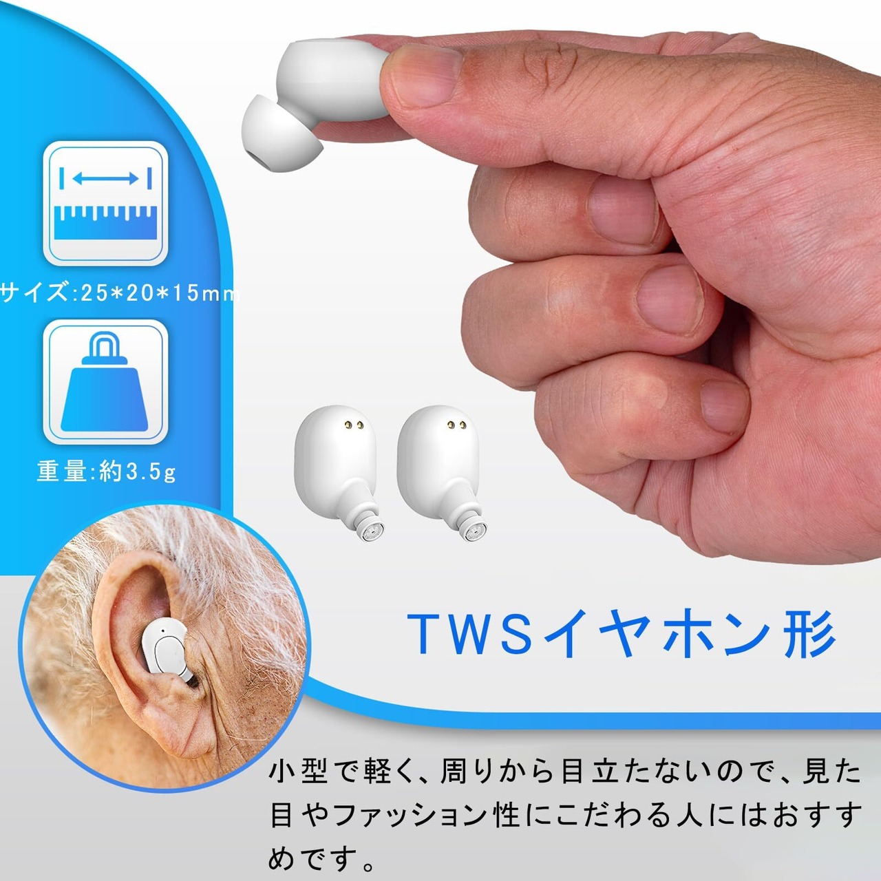 【軽量小型・快適な装着感】重さはわずか約3.5gの超軽量。 人間工学に基づいた設計で長時間使っても疲れにくい快適な着け心地を実現させました。装着しやすく、この集音器は左右を区別する必要はありません。コンパクトで軽量化に設計され、耳への負担を大幅に軽減し、常時使用や長時間使用したい方にぴったりです。小型で軽く、周りから目立たないので、見た目やファッション性にこだわる人にはおすすめです。ご注意:日常生活では、洗顔、洗髪、入浴 水泳の際には必ず集音器を外し、乾燥し場所に置く。