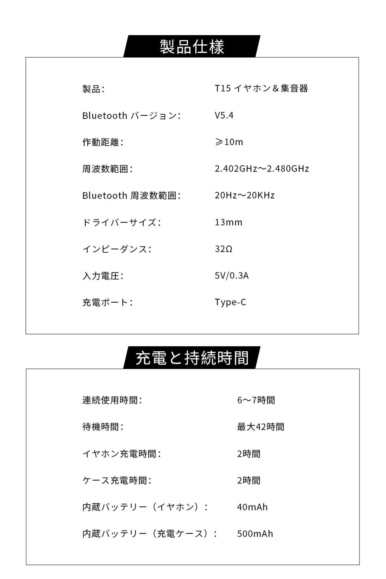 【1台2役~集音/Bluetoothモード】集音器は最先端のデジタル信号処理チップを使用しており、聞きたい音の一つひとつを認識し、大きくクリアな音を出力します。人の声を多角的に認識。ノイズ除去しながら、相手の声の一言一言を丁寧に認識し、自然な聞こえを実現しました。Bluetooth 5.4も搭載されており、携帯電話の Bluetooth をオンにし、「T15」を見つけてクリックすると、5秒後に接続が成功します。接続成功後、音楽/電話/ビデオに対応しています。また、通話の応答と拒否もサポートしています。(ご注意:Bluetoothモードでは集音機能は利用できません。)
