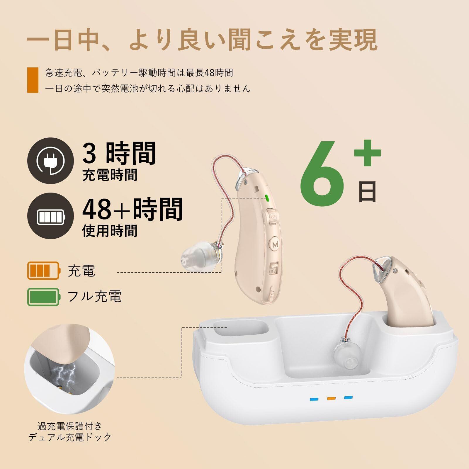 【持ち運び便利・長時間使用可能】手のひらサイズで、ポケットやバッグに簡単に収納でき、どこでも気軽に使用できます。充電式の集音器は、3時間でフル充電され、連続使用で48時間以上使用可能です。充電ケースには追加で140時間の予備電力があり、集音器を約3回充電できます。また、過充電防止機能が搭載されており、過度の充電を心配する必要はありません。