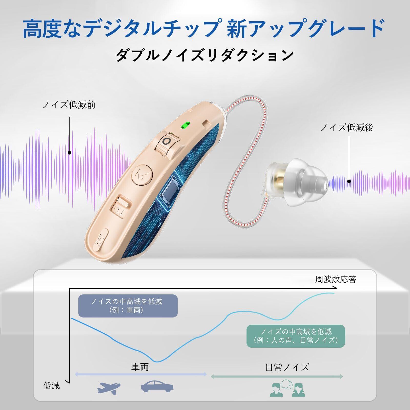 【高性能集音器】高性能チップ処理システムを搭載し、音声の歪みを効果的に軽減し、クリアで自然な音質を保ちます。低遅延、高忠実度出力で、すべての会話が明瞭に聞こえます!日常音からテレビ音声まで、この集音器は公共の場や自宅、旅行先で重要な音を明確にキャッチします。注意:集音器をオンにした後にハウリング音が聞こえる場合は、以下の解決策をお試しください。①集音器が正しく装着されていない場合、再度正しく装着し直してください。②集音器のイヤーピースサイズが合わない場合、適切なサイズのイヤーピースに交換し、より良い密着性を確保してください。