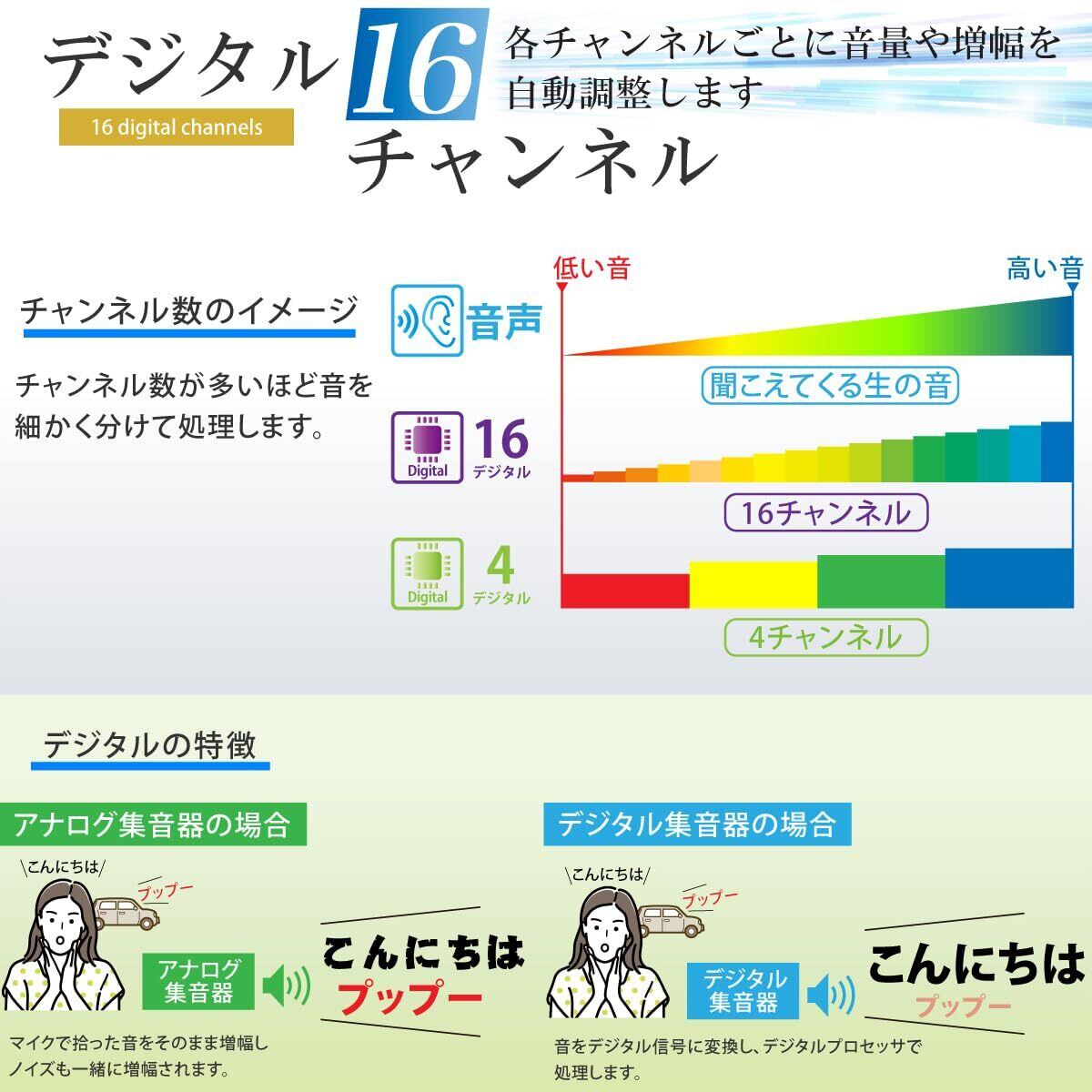 「デジタル16チャンネル」:16チャンネルは各チャンネルごとに音量や増幅を個別に自動調整します。チャンネル数が多いほど音を細かく分けて処理するので、音のひずみが小さく雑音を抑制します