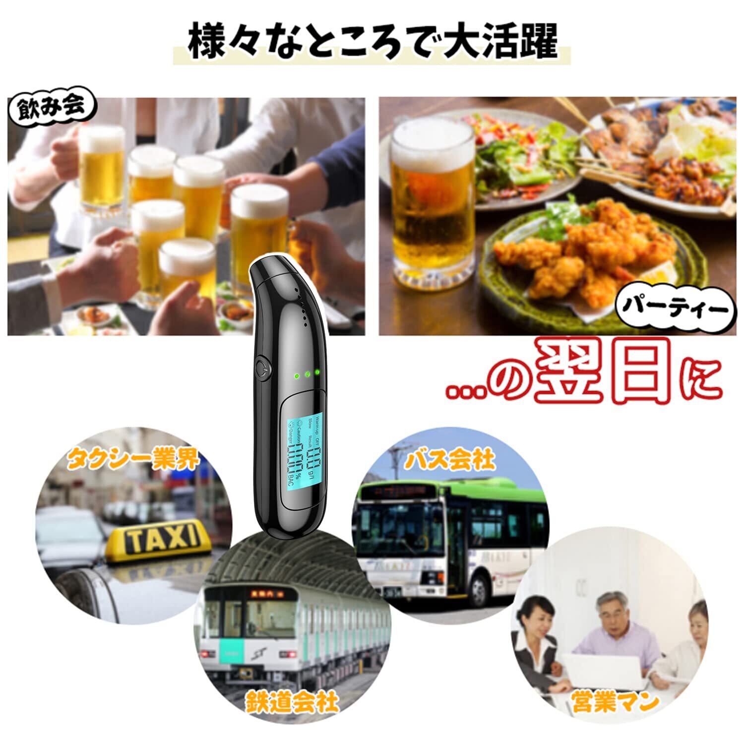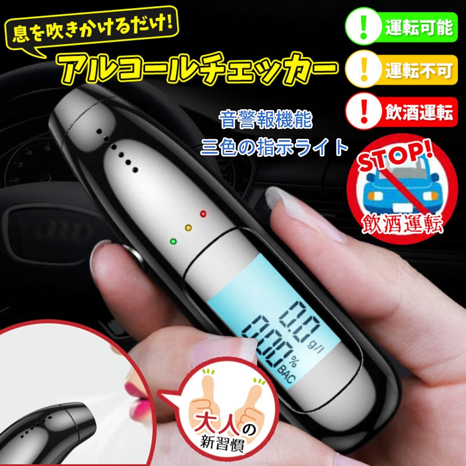 【測定結果一目瞭然&警告音】アルコール検知器はライトがついているので、暗い場所でも見えやすいです。測定データが数字が大きく、コントラストがはっきりしています。また、測定状況に応じて警告音も鳴ります。警告音は測定結果によって、①「未飲酒状態」:アルコール濃度値は0.00%BAC(または0.0 g/L)、緑ランプが点灯します;②「飲酒状態」:アルコール濃度値≥0.01%BAC(または0.1 g/L)、0.08%BAC(または0.8 g/L)未満、黄ランプが点灯します、警告音が鳴らます;③「酔った状態」:アルコール濃度値は0.08%BAC(または0.8 g/L)以上、赤いランプが点灯します、警告音が急速鳴らます。
