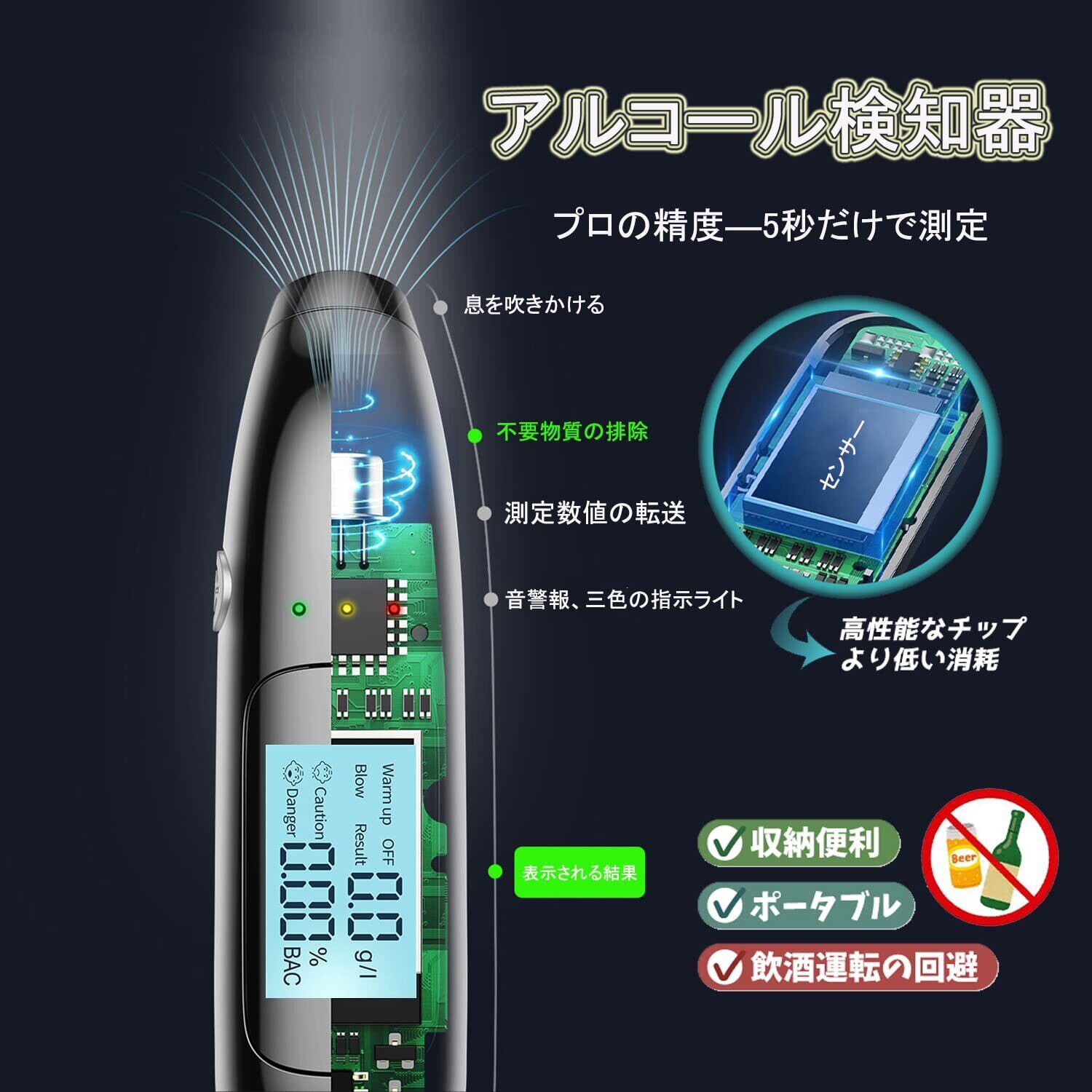 【超高性能・超高精度】:アルコールチェッカーは高性能半導体式ガスセンサーを使用し、強い干渉を防ぐことができます。電源を入れると、余分な空気を自動的に排除し、短時間で正確に検出することを確保します。息を吹きかけるだけで簡単に測定できます。測定範囲:0.00-0.19BAC(0.0-1.9g/L )。ご注意:本製品は飲酒運転の可否を判定する機器ではありません。