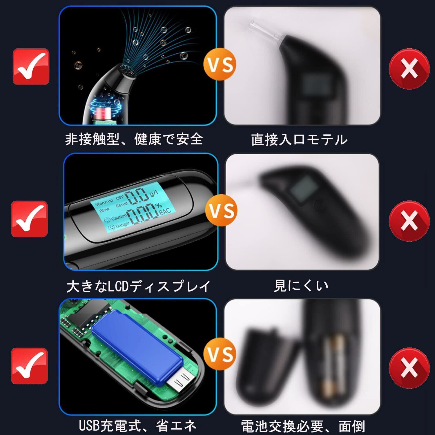 【吹込式・非接触式で安全】:マウスピースを使用していないので、とても衛生的です。1センチの距離で息を吹き測定することができ、衛生的な家庭用アルコール測定器で、1人以上で使用することができます。電源を入れウォームアップ時間を置いた後、息を吹きかけるだけで呼気中のアルコール濃度の測定を簡単にすることが可能です。