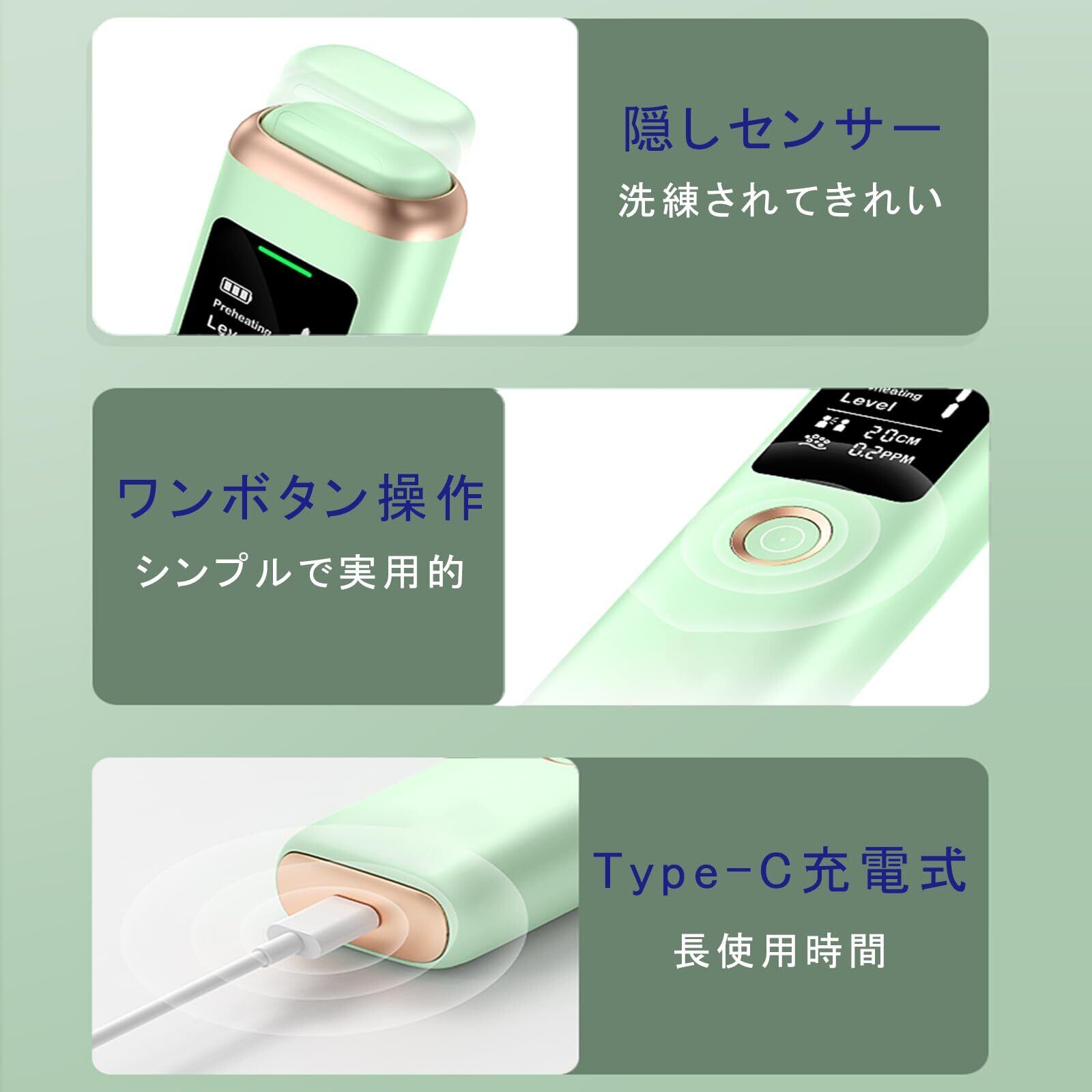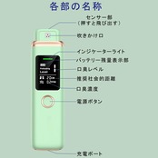 【測定方法】センサー部を飛び出します。電源ボタンを3秒間長押しして電源を入れ、製品は予熱ための9秒カウントダウンに入ります。予熱が完了すると、本体が振動し、青色のインジケーターライトが点滅し、測定状態に入ります。測定状態で、唇を吹きかけ口に近づけ、1cmの距離を保ち、5秒間息を吐きかけます。