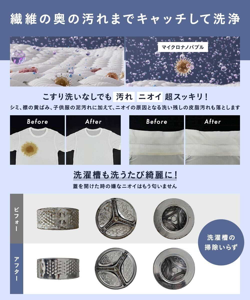 【洗濯のたび、洗濯槽もキレイに】日々の洗濯で、臭いの原因の洗濯槽の汚れをナノバブルが落とします。洗濯槽の嫌なニオイも汚れが原因、洗濯後に蓋を開けた時のイヤなニオイや、衣服へのニオイ移りも減らします