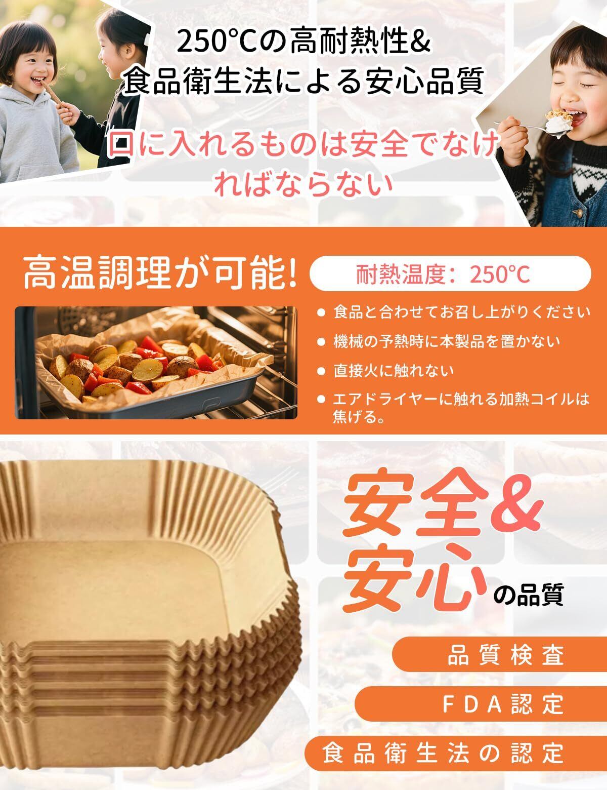 【使いやすい設計】エアフライヤーペーパーの内側は角形のボウルデザインで、裂けたり折りたたんだりすることなく、調理の準備ができたら直接入れることができます。周囲が高く、飛び散りを防ぎます。