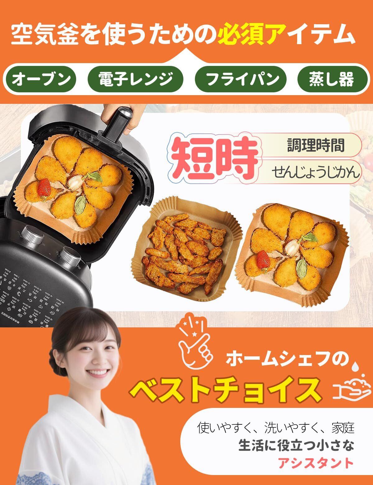 【使い捨てで手入れ不要】エアフライヤー調理用紙は簡単に広げて使用し、使用後に捨てることができます。フライバスケットを汚さずに済むため、毎回の調理後に手入れをする手間が省け、水や洗剤を節約できます。