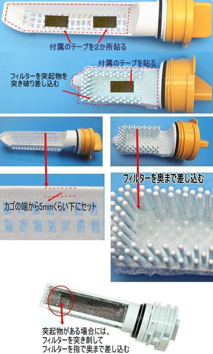 ご使用方法 ・メーカーの「毛取りカゴ」に付いているゴミをきれいに落とし、カゴを十分に乾燥させます。 →「毛取りカゴ」の底のおおよそ上下2か所に、付属の取付テープを貼り付けて下さい。→カゴの高さの端から約5mmくらい下位置にフィルターをセット→フィルターを取付テープに押しつけてしっかりセットして下さい。・カゴに尖った突起物がある場合には、突起物にフィルターを突き刺して、指で突起物の根元まで押し込んで下さい。