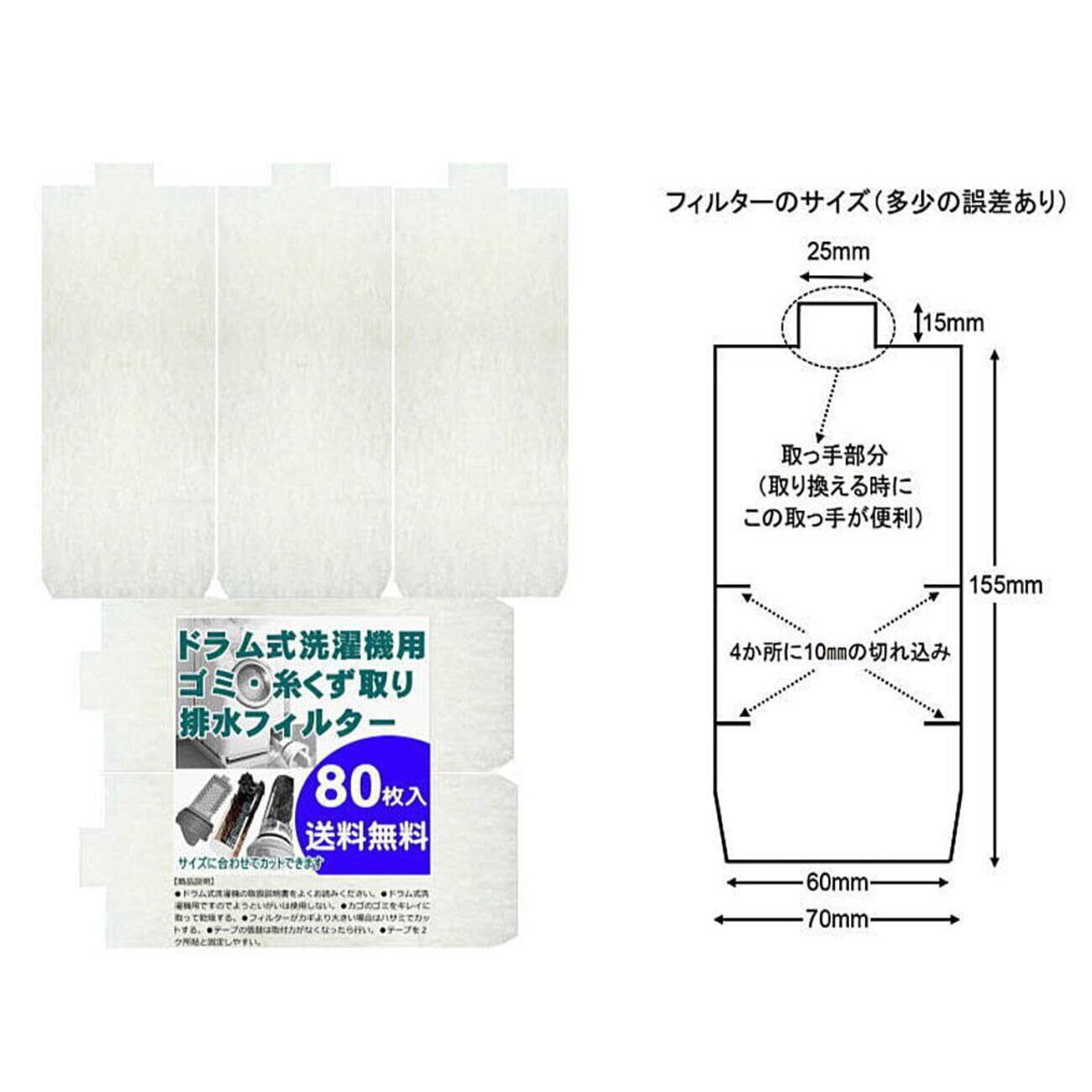 注意事項 ・ゴミ取りフィルターが汚れたまま長時間ご使用されますと、排水がしにくくなる場合がありますので、早めに新しいフィルターに交換して下さい。 ・洗濯機にエラー表示された場合は、ドラム式洗濯機の取扱説明書を良くお読みの上、新しいゴミ取りフィルターに交換して下さい ・ご使用期間の目安は標準で約1週間~10日くらいです。(毎日の使用回数・使用状況によって異なります。) ・ドラム式洗濯機専用です。用途以外に使用しないで下さい。 ・ドラム式洗濯機の取扱説明書を良くお読みの上作業して下さい。 仕様 ご使用目安:約1週間~10日間(使用状況によって異なります。) セット内容:ドラム式洗濯機用ゴミ取りフィルター100枚入りフィルター取付テープ約35片入り サイズ 1枚当たり:約W7×L17cm(本体約15.5cm+取出しツマミ1.5cm)×1.5㎜厚 フィルター材質:不織布で繊維組成はポリエステル、ビニロン 製造法:ケミカルボンド式(薬品やボンドなどで接着するのでなく熱加工で製造のため、この製造法は衛生的で食品の包装にも使用される) 取付用テープ材質:ナイロン 生産国:日本