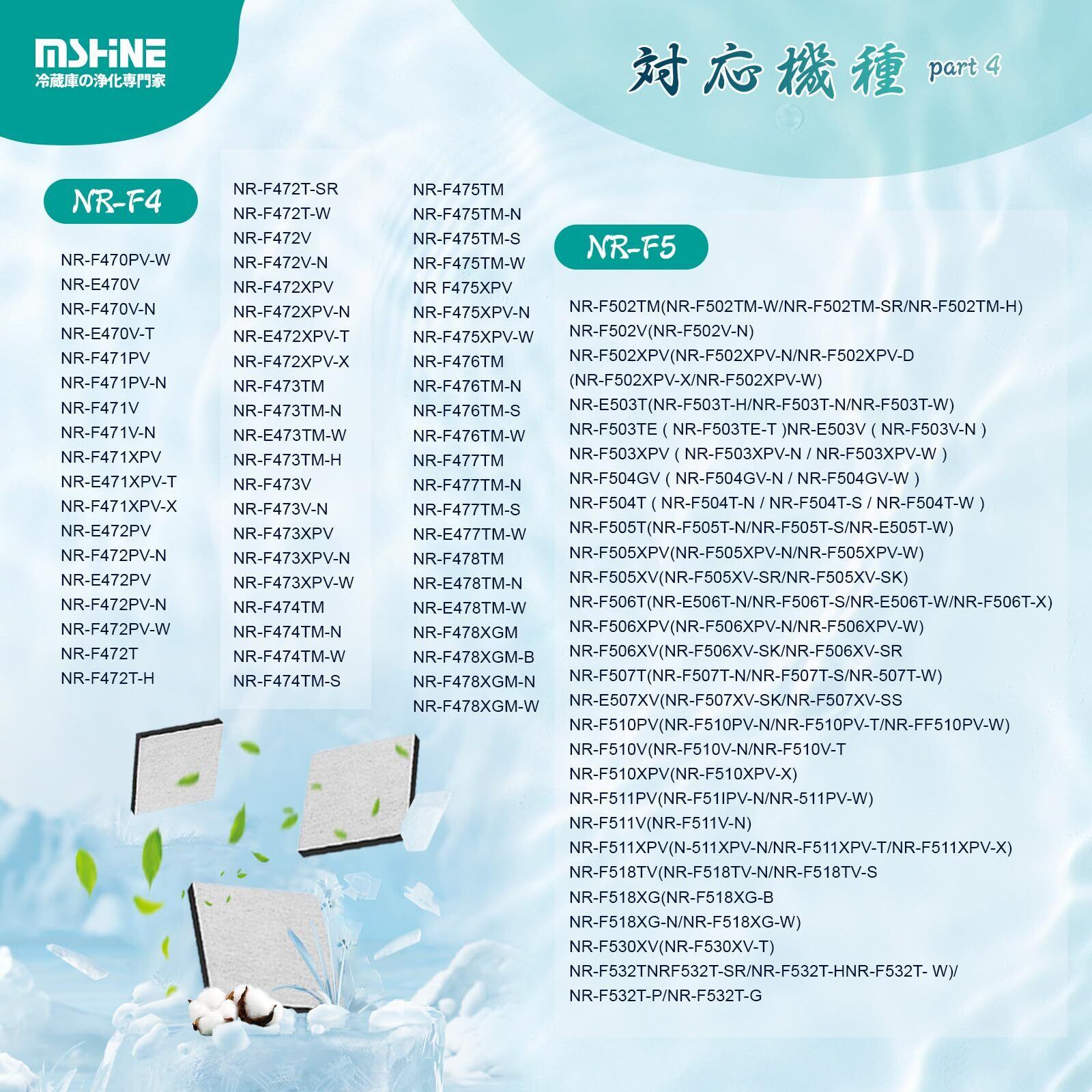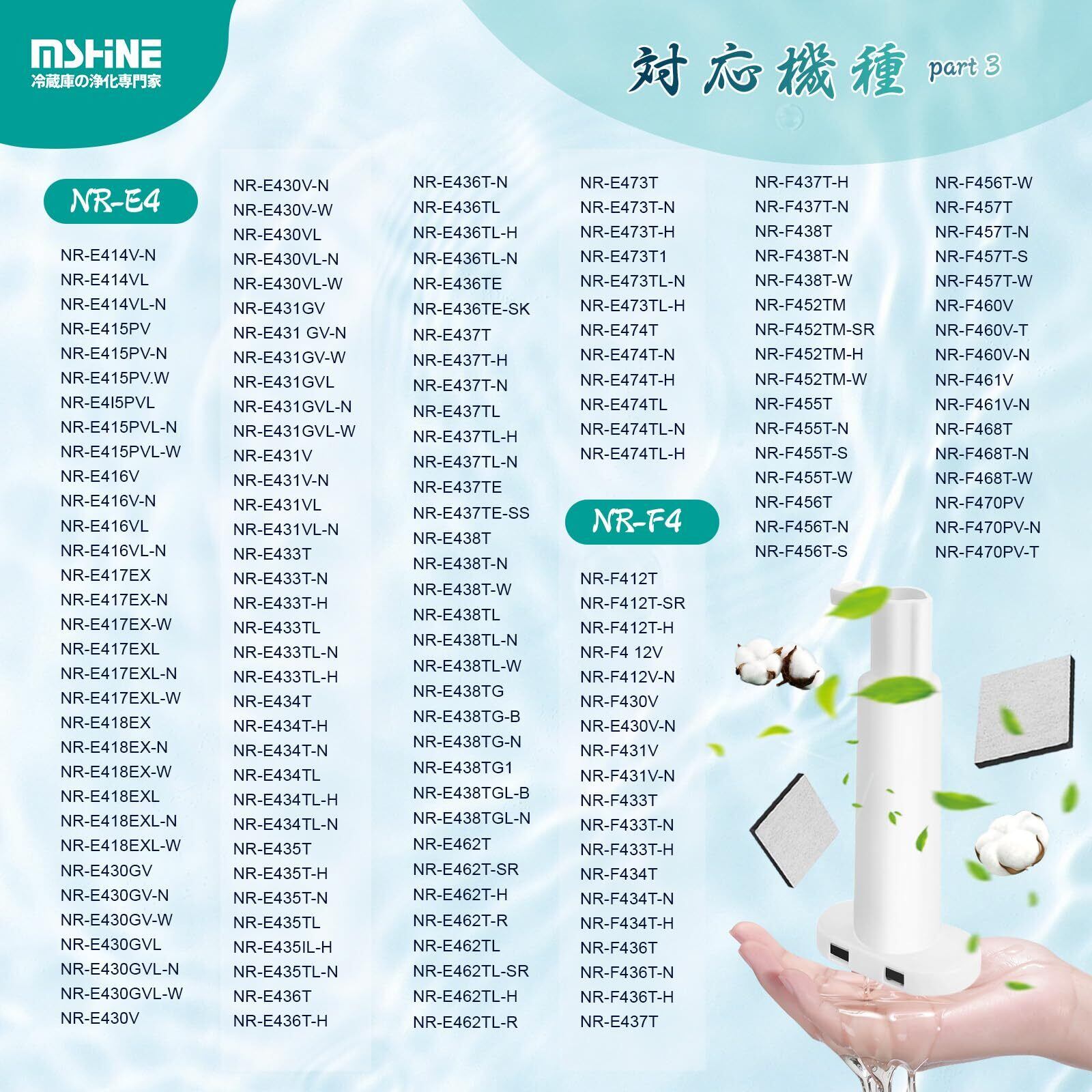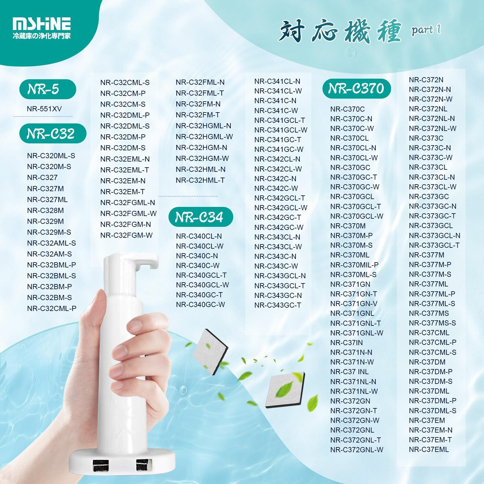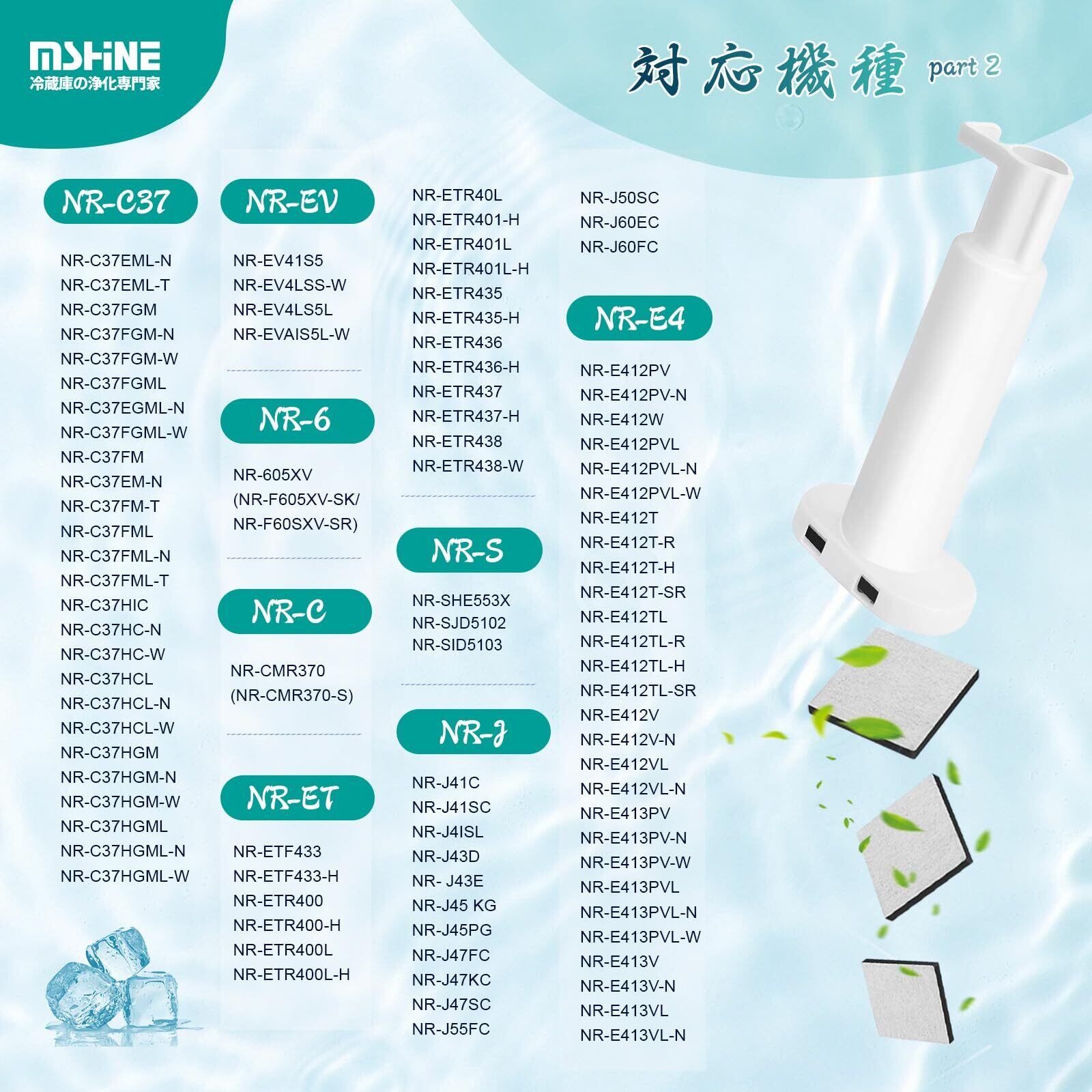 【対応機種】NR-C343C、NR-C373GC、NR-E417EX、NR-E418EX、NR-FVF456、NR-C342C、NR-C342GC、NR-FVF458、NR-E418EX、NR-C343GC、NR-C373C、NR-E417EXL、NR-E418EXL、NR-C341C、NR-E416V、NR-FV45S3、NR-C342CL、NR-E415PV、NR-F505XPV、NR-ETR436、NR-F506XPV、NR-E437TE、NR-F568XG、NR-F503T、NR-J41SC、NR-C32HM、NR-C371N、NR-FTF456、NR-C371GNL、NR-F503XPV、NR-F511XPV、NR-C32DM、NR-C372N、NR-C372NL、NR-F510PV、NR-F455T、NR-F475TM、NR-F434T、NR-F532T、NR-C341GCLのcnr mj-108850 浄水フィルターはパナソニック 冷蔵庫製氷機フィルターおよび上記の冷蔵庫モデルに対応しています。