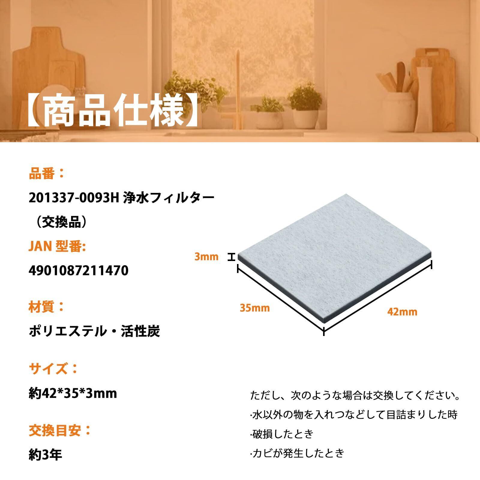 【商品仕様】 201337-0093H 冷蔵庫フィルター(交換品)材質:ポリエステル・活性炭 JAN 型番:4901087211470 機能:水道水をろ過して水中に含まれる不純物を除去する。カルキ臭を低減する。 サイズ:42*35*3mm