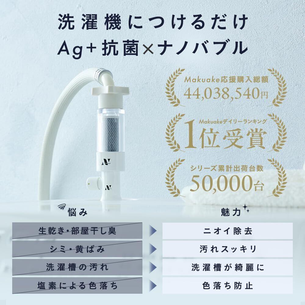 【つけるだけで、洗濯が変わる。】毛穴より小さいナノバブルの優れた洗浄力に加えて、Ag+抗菌で菌の繁殖を防ぎニオイ除去&99%塩素除去で色落ち防止して衣類本来の色をキープ